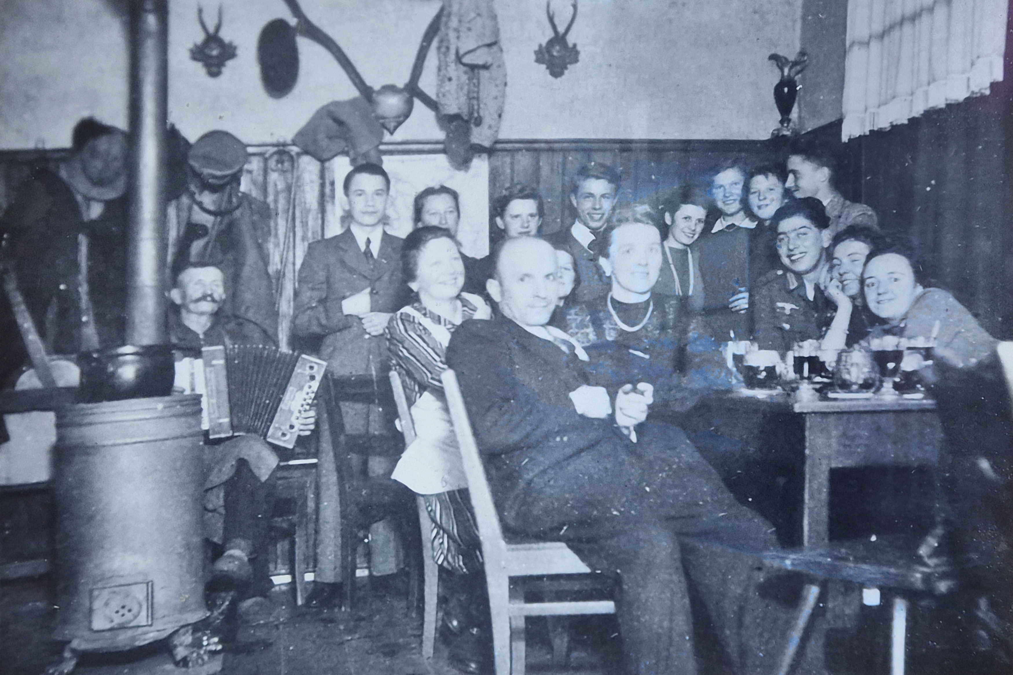 Das vorliegende Schwarzweißfoto zeigt eine gesellige Runde in der rustikalen Gaststube des Hammerl, vermutlich aufgenommen in den späten 1930er oder frühen 1940er Jahren. Die Szenerie lässt sich anhand der Kleidung, Einrichtung und fotografischen Merkmale zeitlich auf die Jahre zwischen 1935 und 1945 eingrenzen – sehr wahrscheinlich während des Zweiten Weltkriegs. Die Anwesenheit von Männern in Wehrmachtsuniformen bestätigt diesen Zeitraum zusätzlich.
