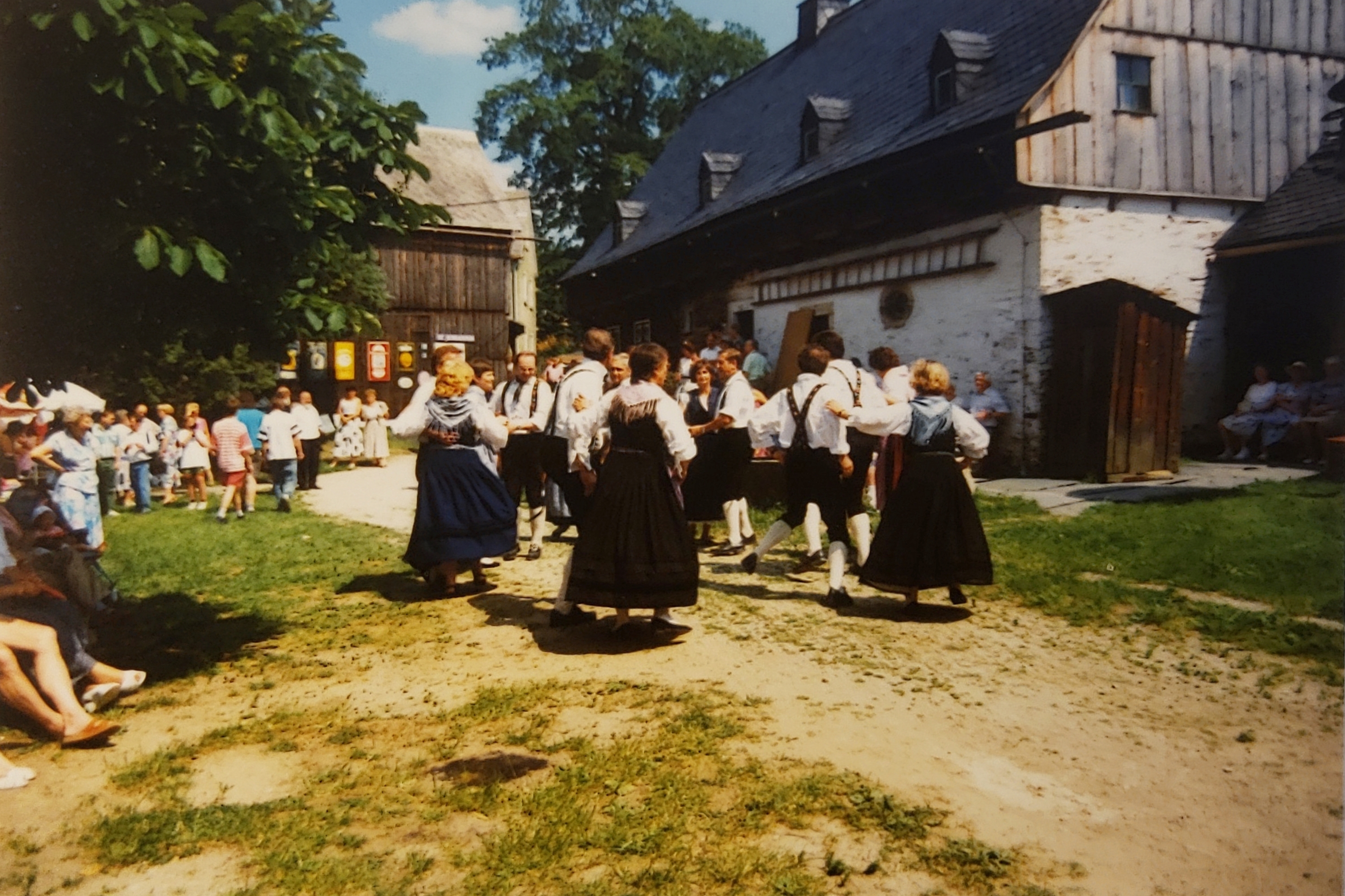 Besucher schauen einer Trachtengruppe beim Tanz im Museumshof zu.