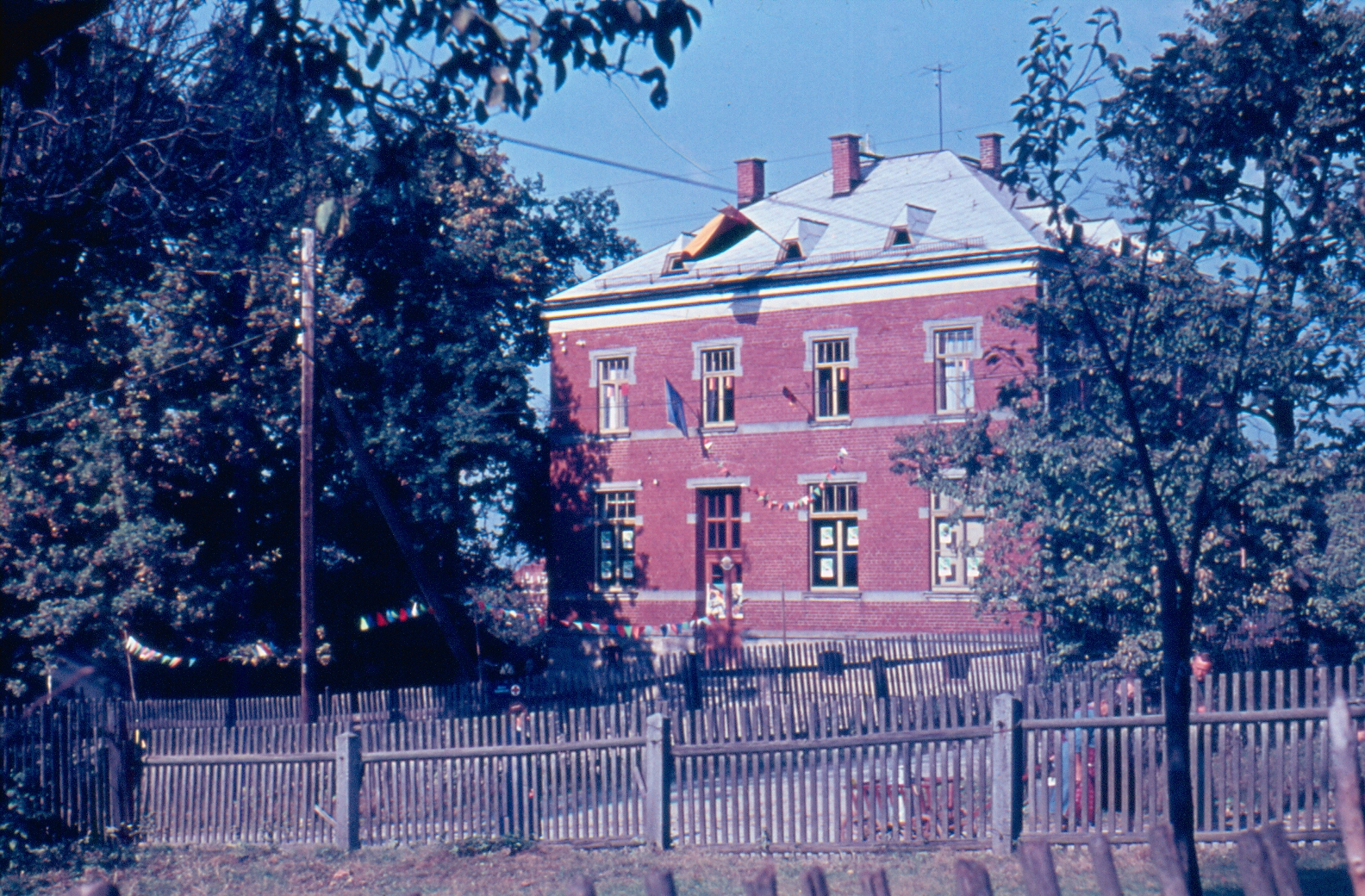 Das mit Wimpelketten, Fahnen und Plakaten zur 650-Jahrfeier geschmückte Schulgebäude. Auf der davor verlaufenden und mit Gartenzäunen umgebenen Rohrbacher Straße sind Fußgänger mit einem Handwagen zu sehen.