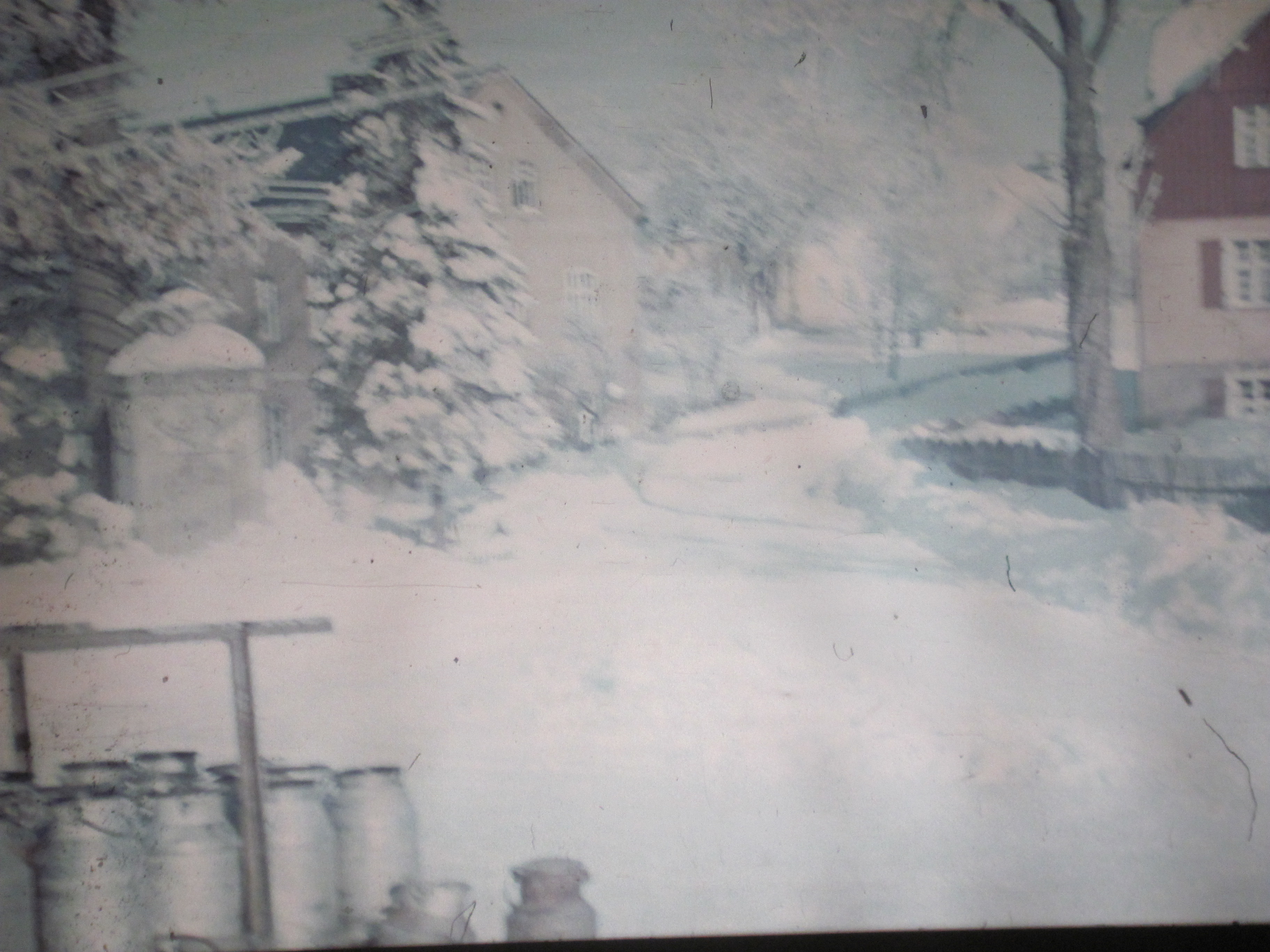 Am Milch-Häusel am Kriegerdenkmal bereitgestellte Milchkannen aus Aluminium für die Abholung und Weiterverarbeitung. Die Straßen sind tief verschneit.