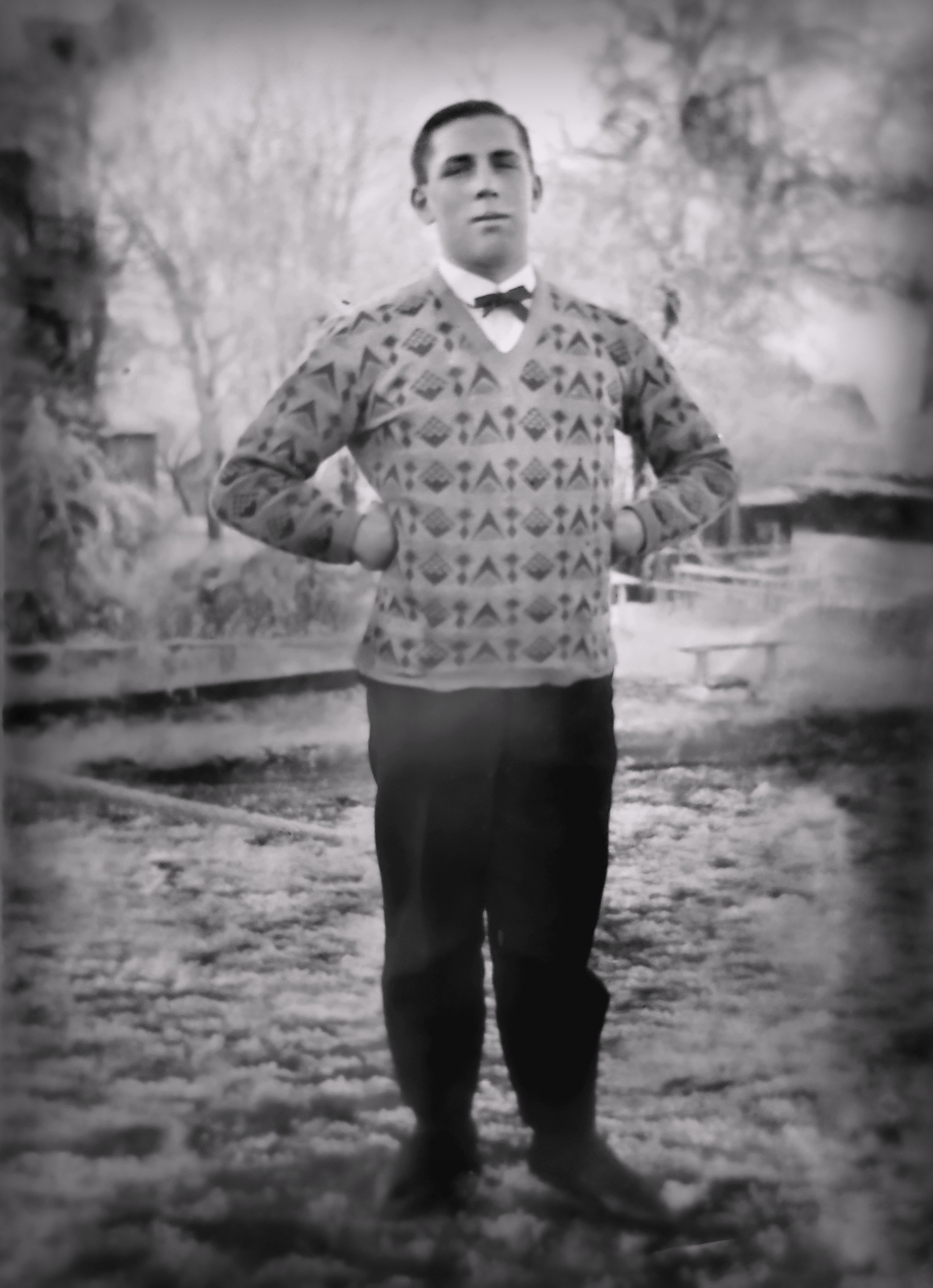 Der Wirt Horst Adler, der das Ross bis 1958 betrieb (danach Verkauf), mit Pullover im Schnee.