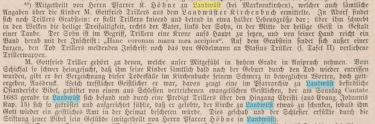 Der Grabstein des Pfarrers Triller (1673 bis 1684 in Landwüst) ist in der Adorfer Kirche noch gut erhalten und wird hier beschrieben, auch, dass ein von Gödelmann (kurfürstlich sächsischer Rat) 1609 an Blasius Trüller (Stadtschreiber zu Chrimmitzschau) verliehenes Triller-Wappen zu sehen sei. Auch wird eine Osiandersche Bibel, die von einem schlesischen Geistlichen für die Kirche zu Landwüst gespendet wurde, erwähnt.
