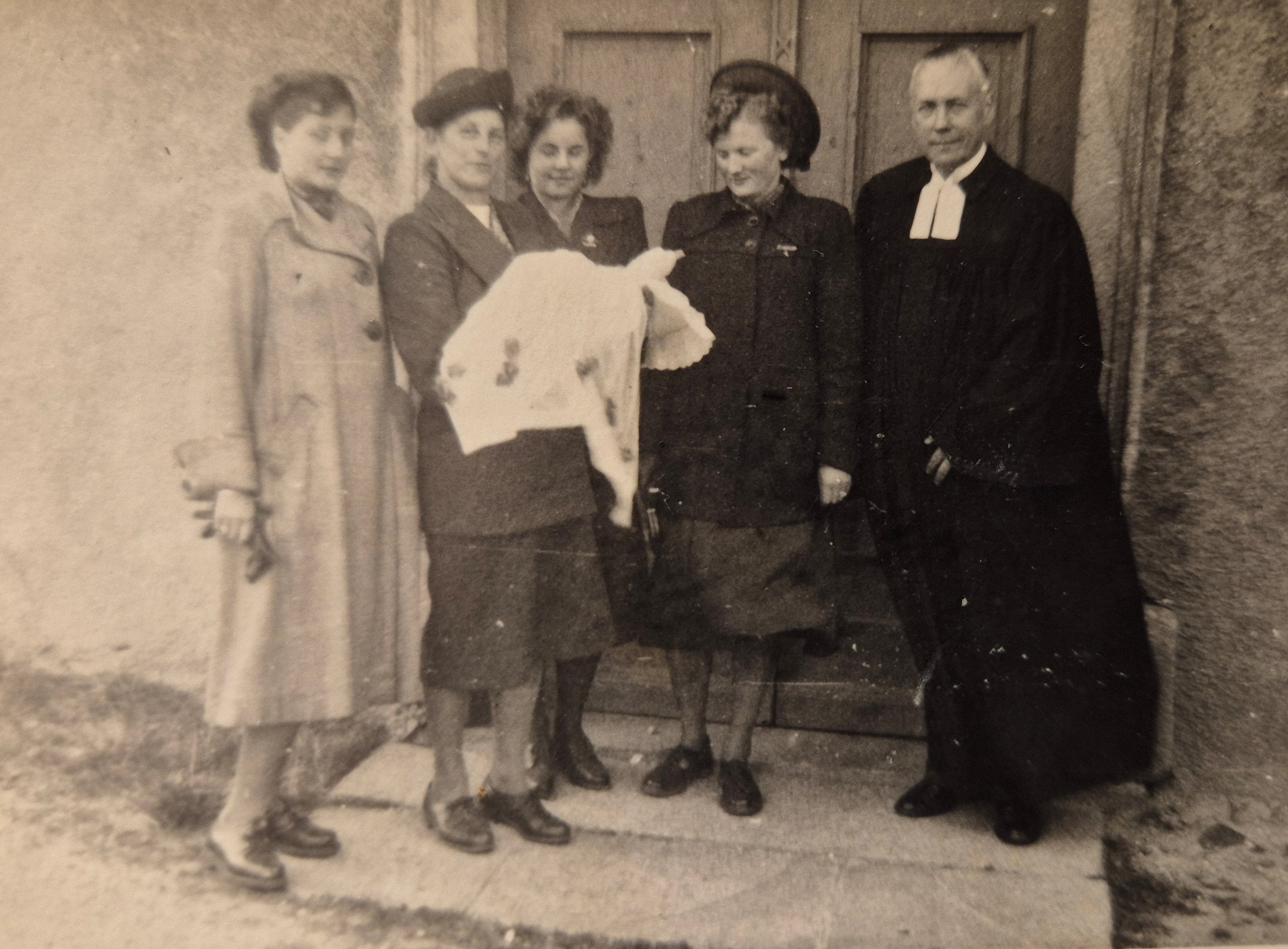 Eine Gruppe von Frauen steht zusammen mit Pfarrer Paul Alexander Christian Pelling (Senior) mit dem getauften Baby vor der Kirchentür.