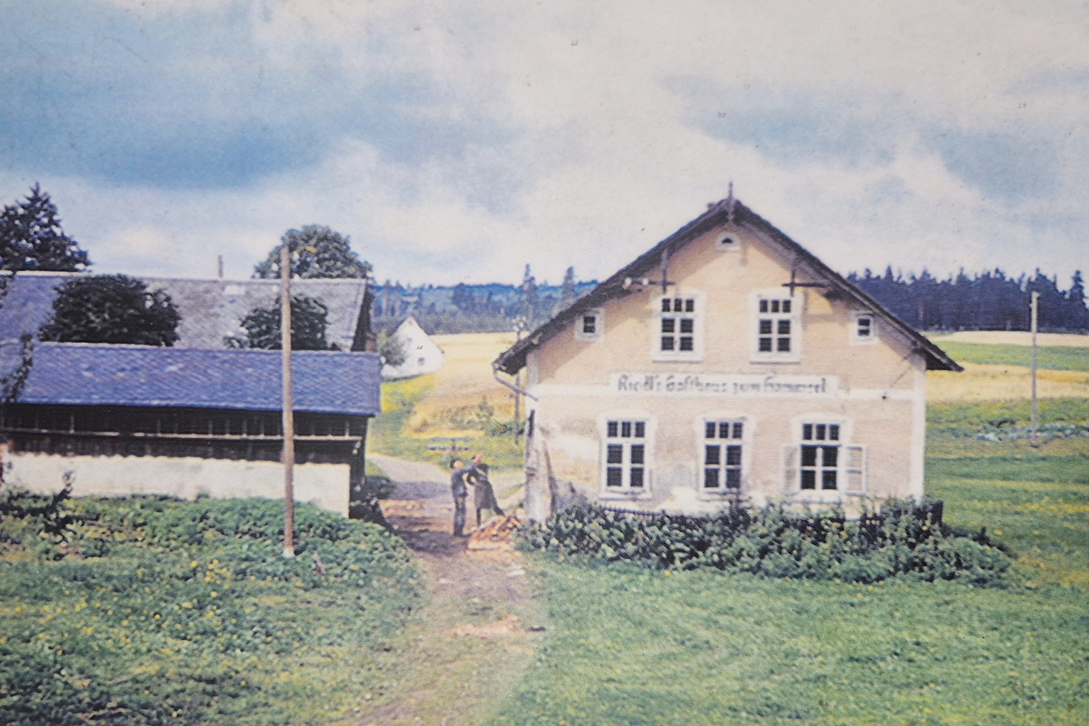 In dem Nachbardörfchen von Landwüst, Hennebach (heute zu Brambach), befand sich noch 1791 eine Mahlmühle und ein Eisenhammer. An letzteren erinnerte Riedels Gasthaus zum Hammerl, welches heute ein gut besuchter Imbiß ist. Das farbige Foto zeigt eine ländliche Idylle mit dem Gasthaus im Mittelpunkt, eingebettet in eine sanfte, offene Landschaft. Die Aufnahme dürfte in den 1950er oder frühen 1960er Jahren entstanden sein, erkennbar an der Farbqualität des Bildes, der Kleidung der abgebildeten Personen und dem Zustand der Gebäude. Es handelt sich um eine Farbfotografie aus der Zeit, in der Farbfilm allmählich erschwinglicher und verbreiteter wurde.