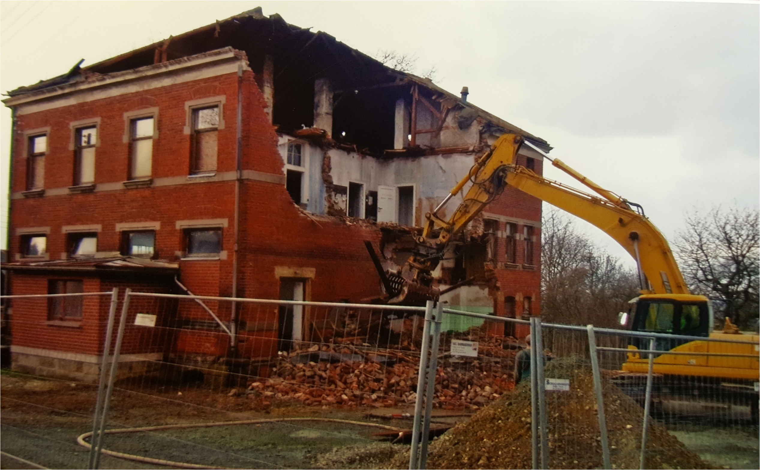 Abriss des Gebäudes der (neuen) Schule mit Bagger, ein Grundstein wurde nicht gefunden (auch nicht gesucht)