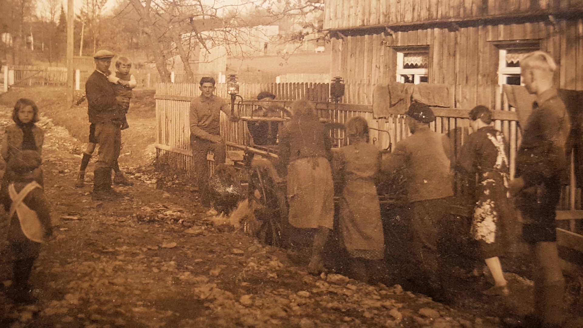 Auspumpen eines Kellers mit Handdruckspritze nach dem Unwetter vom 23.05.1935