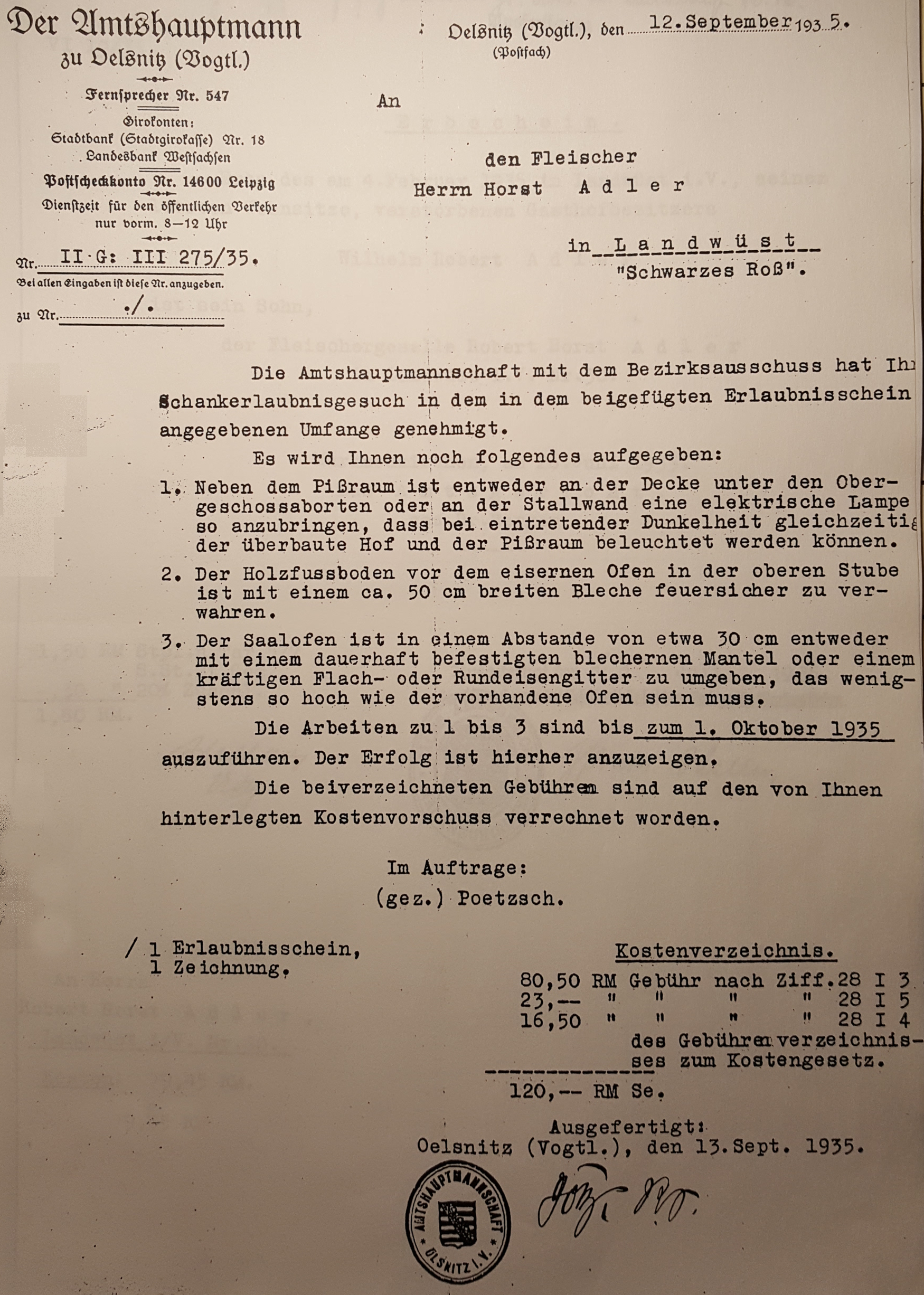 Schreiben des Amtshaupmannes (OelsnitzVogtl.) mit Hinweis auf Ausschankerlaubnis, AUflagen zur Beleuchtung des Pißraumes und des Brandschutzes an Ofen in der oberen Stube und im Saal