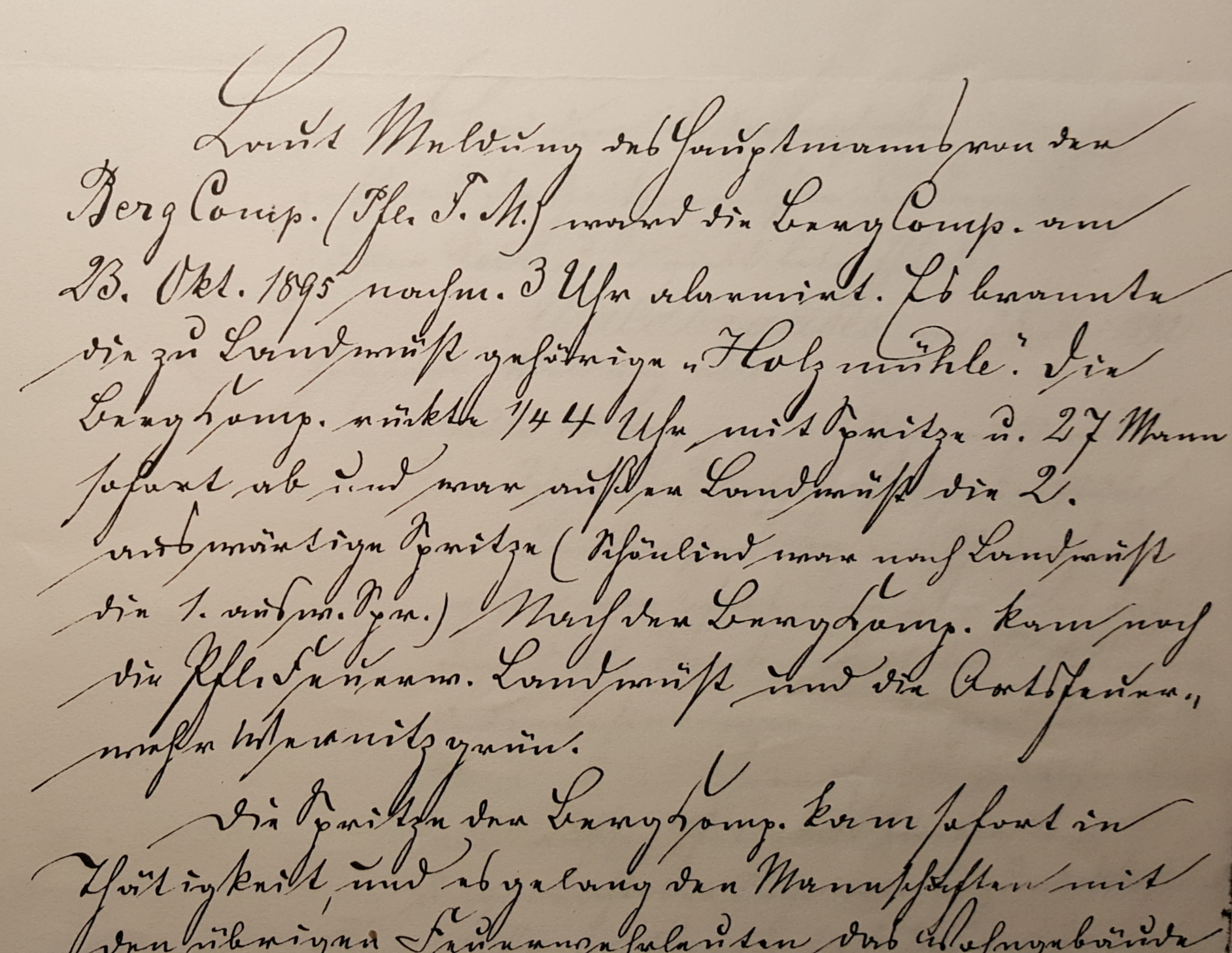 Laut Meldung des Hauptmanns der BergComp. (Pfl F.M.) ward die BergComp. am 23. Okt. 1895 nachm. 3 Uhr alarmiert. Es brannte die zu Landwüst gehörige Holzmühle. Die BergComp. rückte viertel 4 Uhr mit Spritze u. 27 Mann sofort ab und war außer Landwüst die 2. auswärtige Spritze (Schönlind war nach Landwüst die 1. ausw. Spr.) Nach der BergComp. kam noch die Pfl Feuerw. Landwüst und die Ortsfeuerwehr Wernitzgrün. Die Spritze der BergComp. kam sofort in Thätigkeit, und es gelang den Mannschaften mit den übrigen Feuerwehrleuten das Wohngebäude...