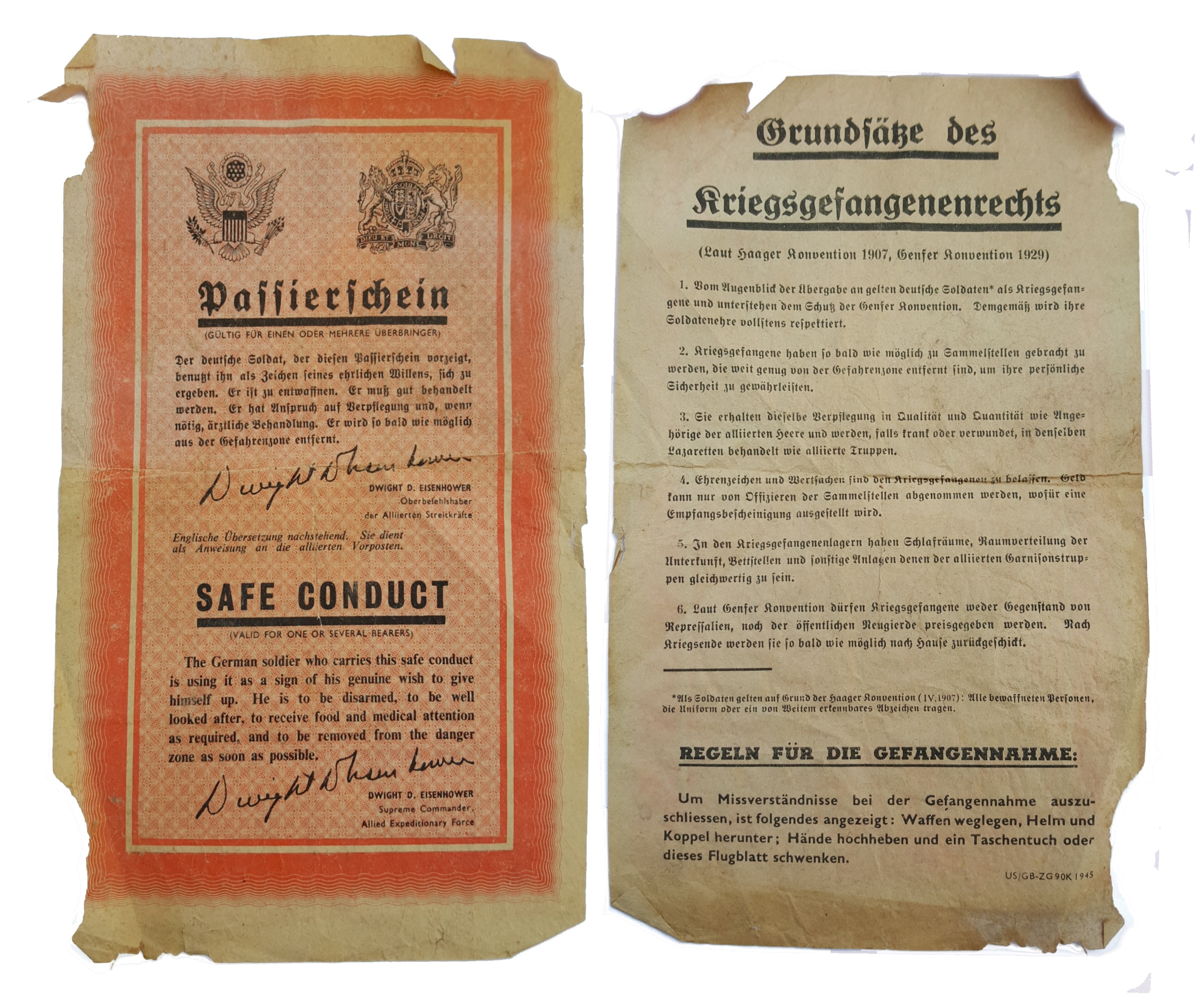Von den Alliierten mit Flugzeug über dem Dorf abgeworfener Passierschein, der den deutschen Soldaten die Möglichkeit gab, das Kriegsende lebend zu erreichen.