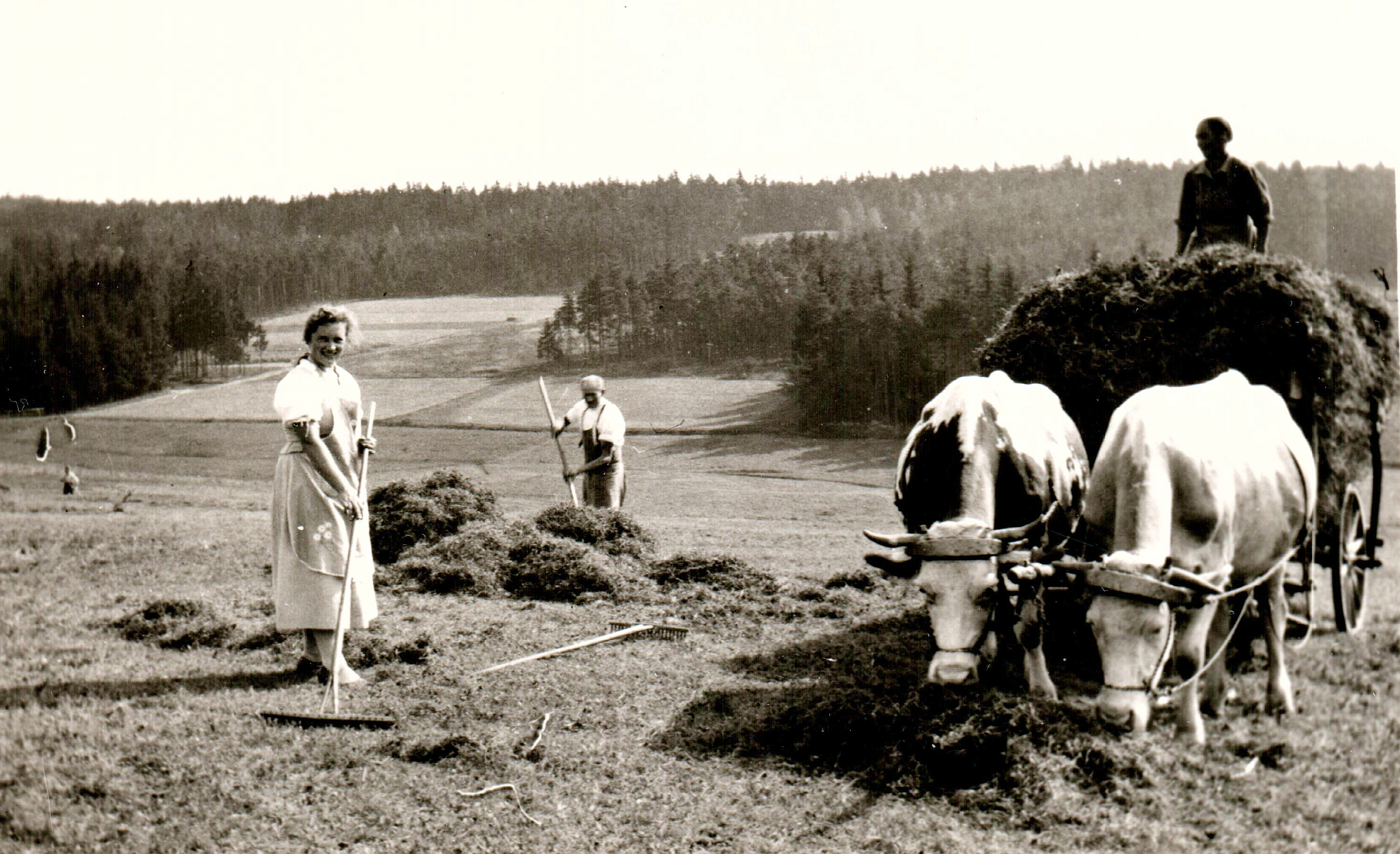 Das getrocknete Gras des 2. Grasschnitts in Juli bzw. August wird mit Holzrechen zusammengerecht und mit Ochsen vor dem Wagen zur Scheune eingefahren.