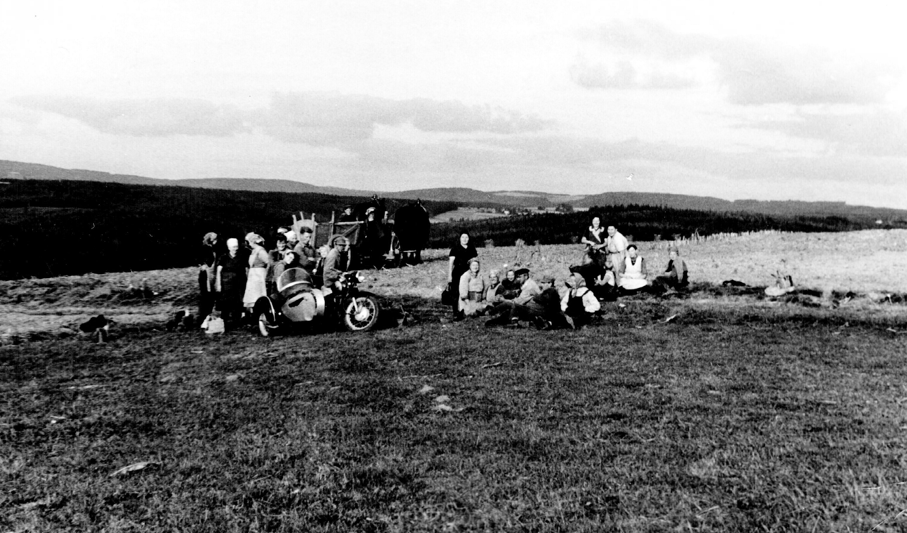 Bäuerinnen und Bauern bei einer Pause, Motorrad im Vordergrund, Pferdewagen im Hintergrund