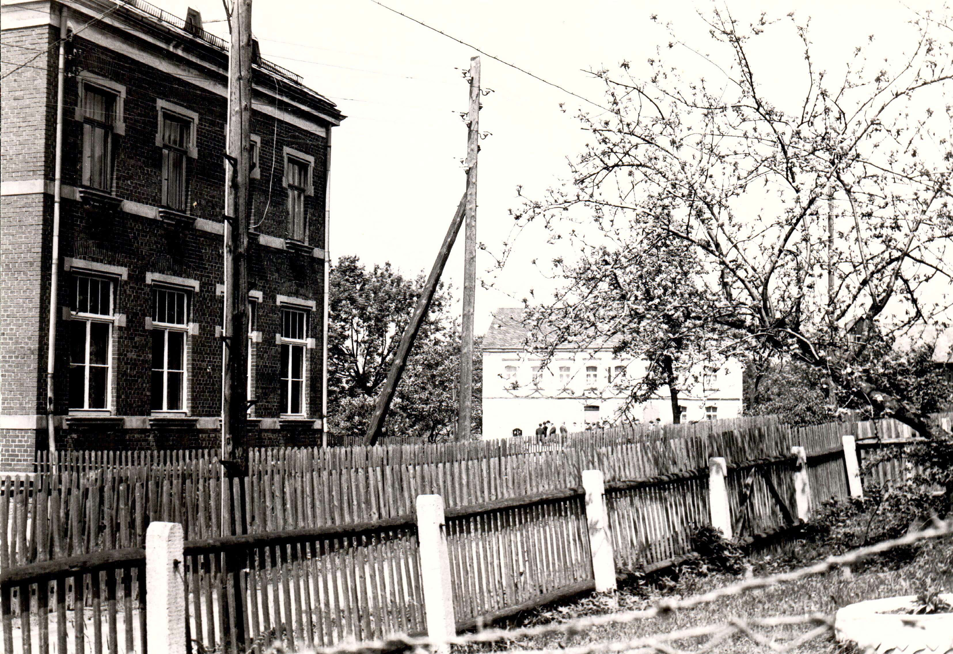Eröffnung Landwüster Bauernstübels mit 56 Quadratmetern im ausgebauten Stallboden des Dorfkonsums (Spitzenhaus, Nr.13) am 16. Juli 1961, links die neue Schule, geradeaus das Spitzenhaus mit Menschengruppe davor. Den Schlüssel musste man sich bei der Konsumverkäuferin abholen.