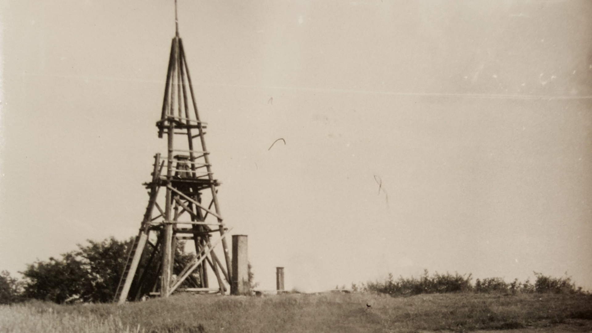 Trigonometrischer Punkt auf dem Wirtsberg, hier noch mit ca. 15m hohem Balkengerüst, der fehlende Balken stammt von der Nutzung durch die russische Armee anläßlich der Niederschlagung des Prager Frühlings