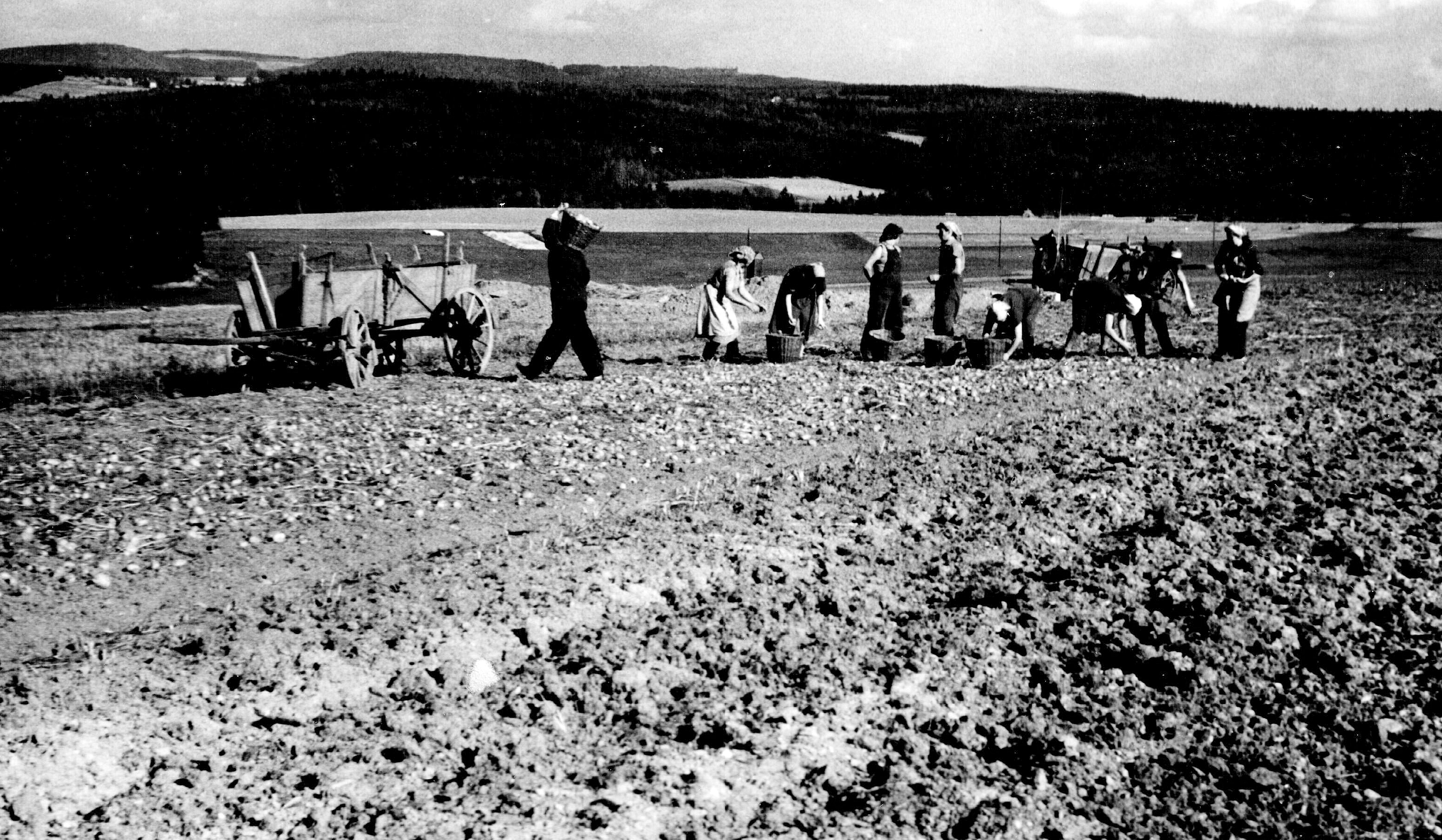 LPG-Bäuerinnen beim Kartoffel-Lesen mit Körben und Pferdefuhrwerken