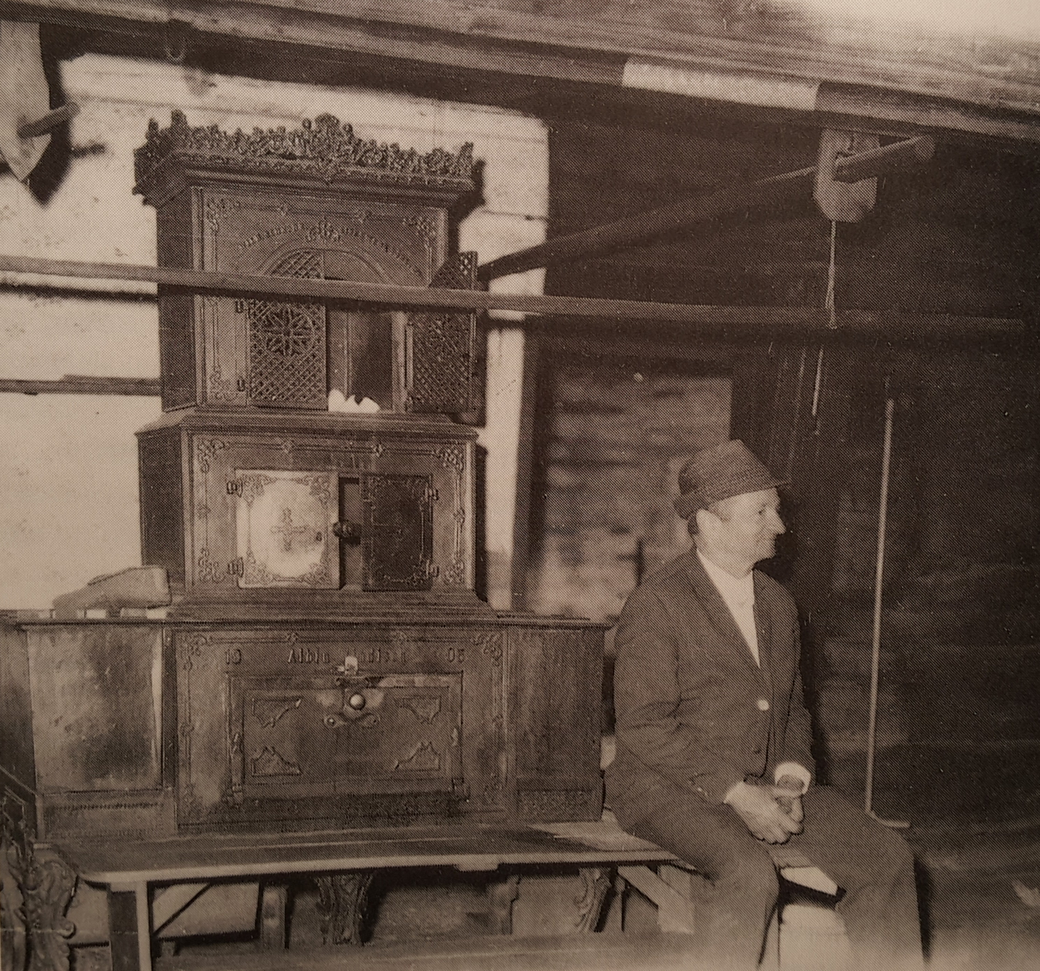 Walter Wunderlich im Museum auf Ofenbank vor gußeisernem Ofen sitzend
