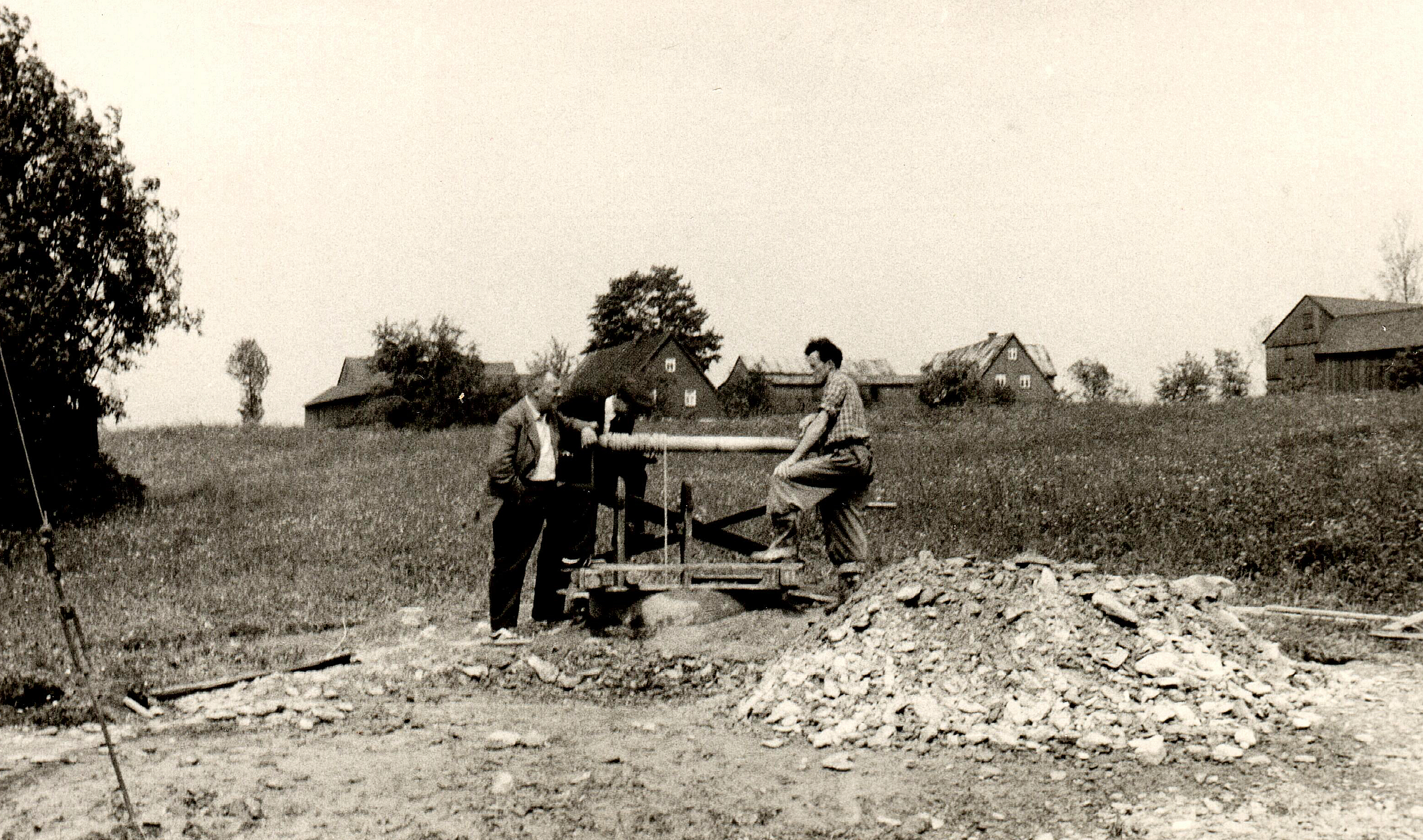 Männer mit Seilwinde beim Brunnenbau im Dorf