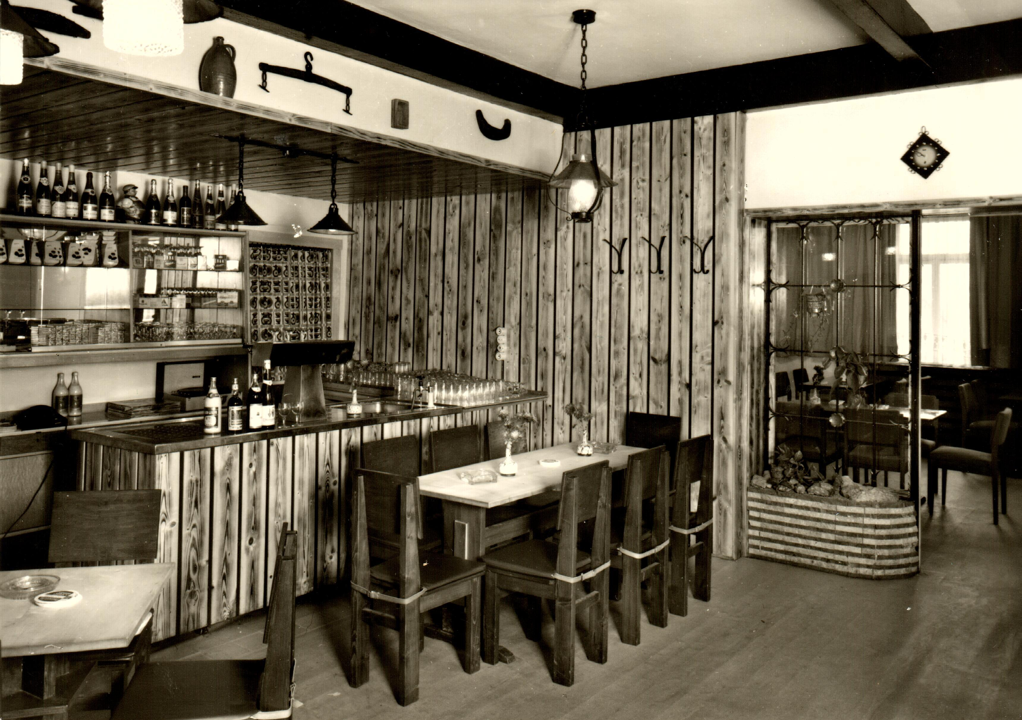 Theke und Gastraum im Goldenen Stern mit Tür zum Vorraum vom Saal, Flaschen typischer Getränke. Im Sall fanden alle größeren Veranstaltungen des Dorfes statt.
