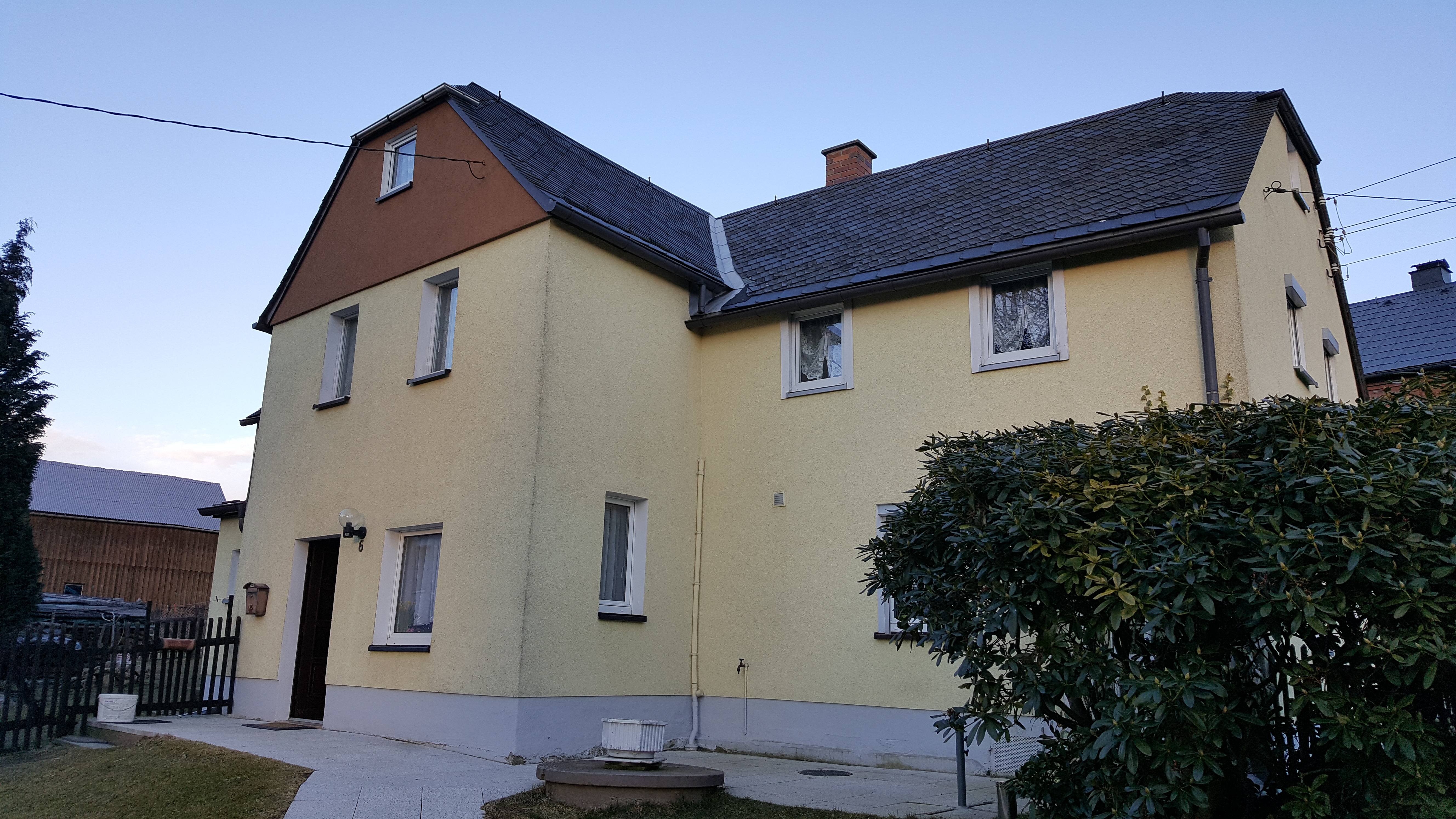 Gedämmtes Bauernhaus mit BRunnen im Vordergrund, links Hühnergarten