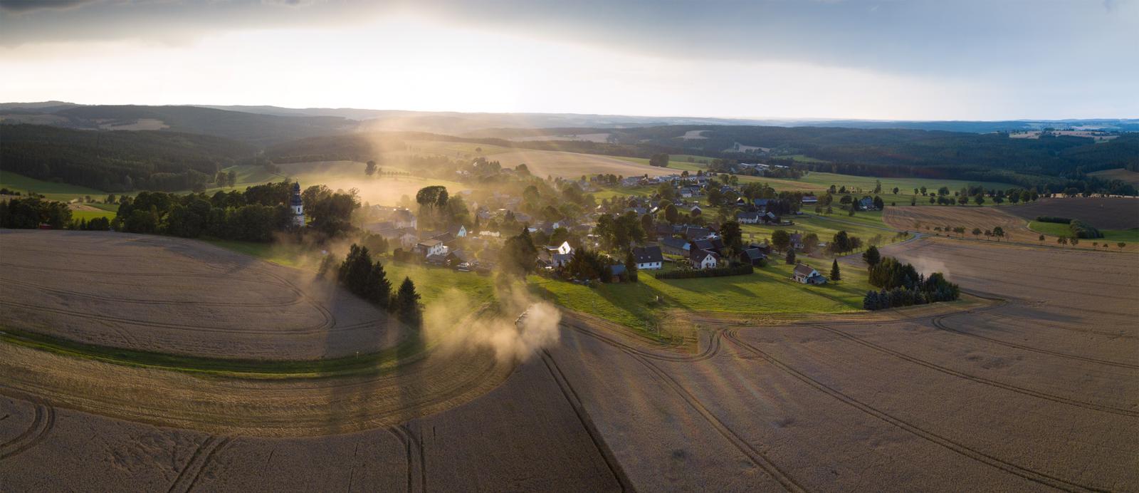 Blick über das Gesamte Dorf, Fahrzeuge auf den Feldern um Landwüst bei der Getreideernte, mit Staubfahnen, links die Kirche, rechts die Hule