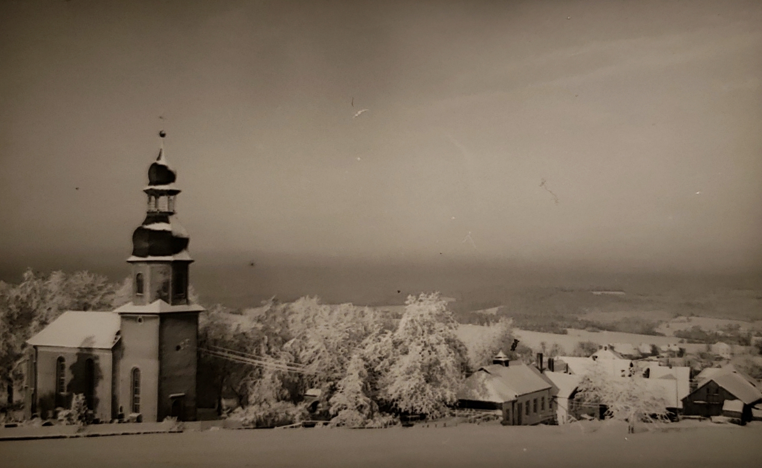 Das schneebedeckte Dorf vom Wirtsberg aus gesehen, rechts am Feldrand das Schwarze Roß mit Biergarten.