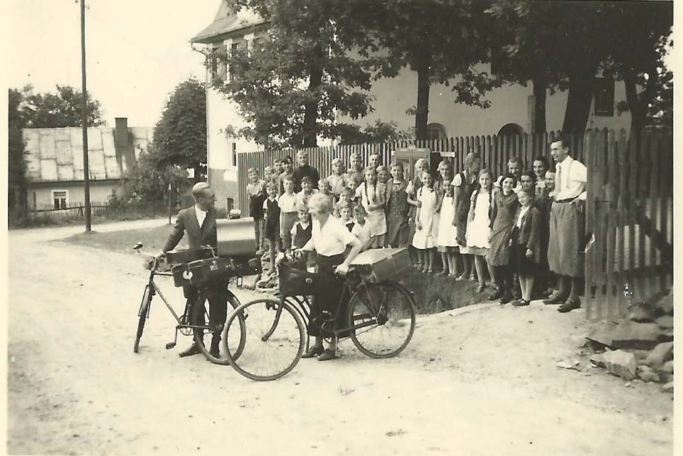 Eine Klasse steht mit Lehrern entlang des Zauns vor der Schule, Im Hintergrund der Thüringer Hof. Der Lehrer rechts ist Johannes Petzold, ein Kirchenmusiker und Komponist, der in den 1930iger Jahren als Lehrer in Landwüst tätig war. Trotz geäußerter Bedenken wurde er während seiner Tätigkeit in Landwüst, rückwirkend zum 01.05.1937 in die NSDAP aufgenommen. Als 1938 fast alle Lehrer (angeblich) spontan den Religionsunterricht niederlegten (ohne daß dieser selbst abgeschafft wurde), machte es ihm große Freude, den Unterricht der Kollegen mit zu übernehmen (eigener Lebenslauf vom 09.08.1964).