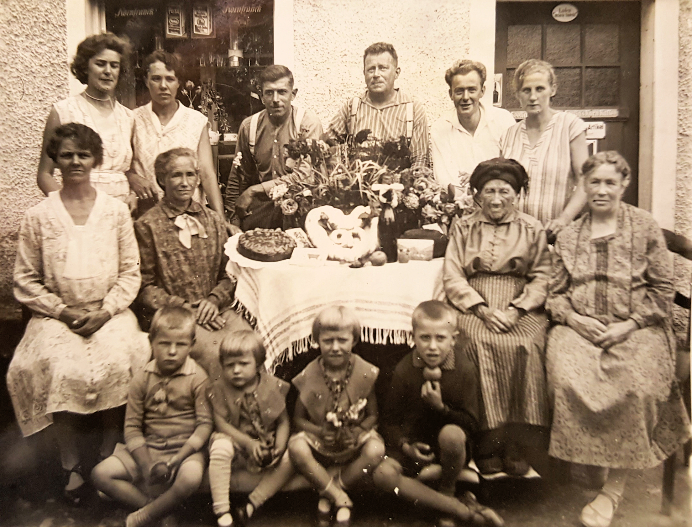 Vor dem Eingang der Bäckerei wurde ein Tisch mit Torten und Blumen angeordnet, um den die ganze Familie für ein Foto angeordnet wurde. Auf der Torte ist das Wort Geburtstag zu lesen. Im Hintergund ein kleines Schaufenster und die Eingangstür.