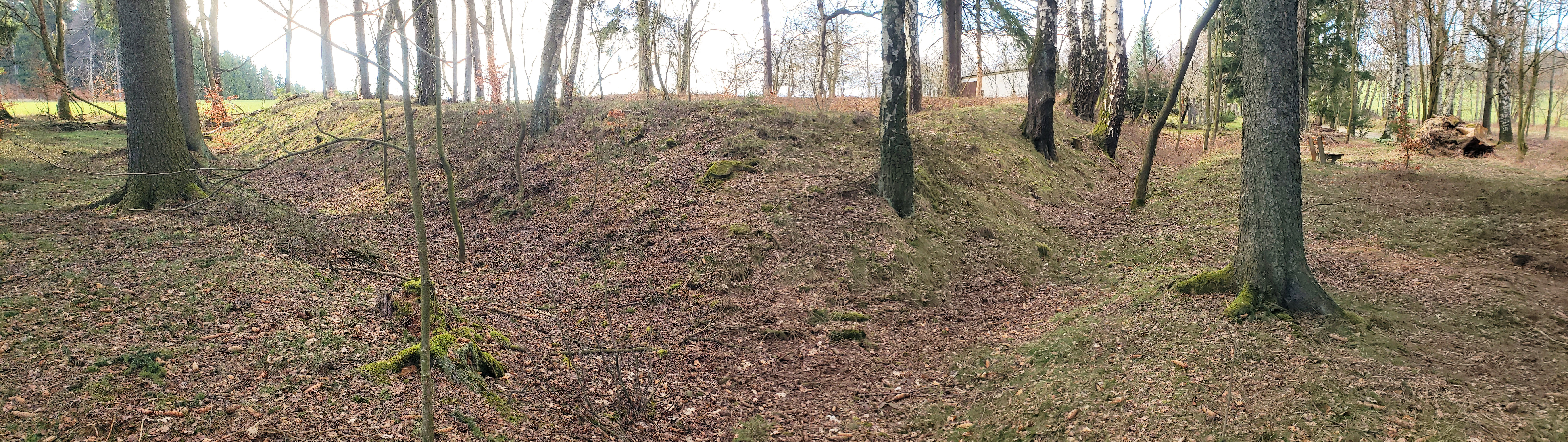Zu sehen ist die komplette, mit großen Birken bewachsene Schweden-Schanze mit Blick nach Norden, rechts verläuft die alte Heeresstraße (jetziger Kammweg).