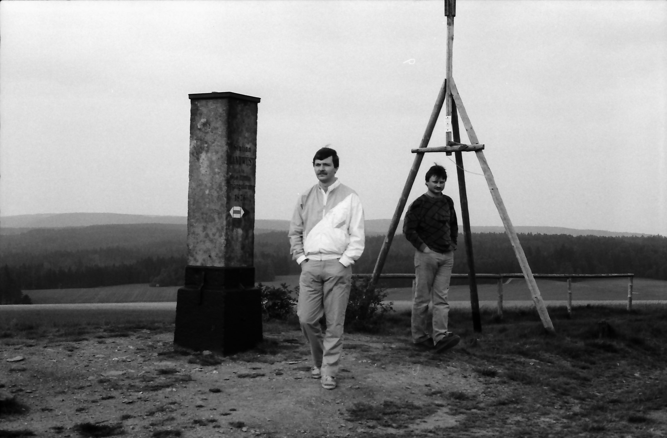 Zwei Personen an der alten Vermessungssäule und einem ca. 3-4m hohen trigonometrischen Punkt aus Holz