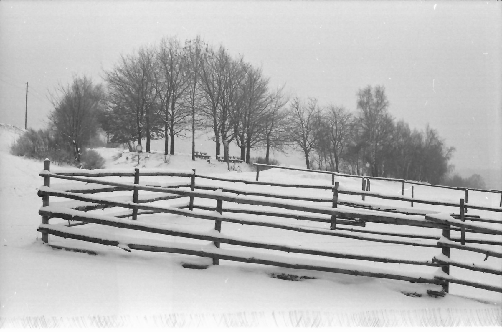 Blick vom unteren Ende des Friedhofs über ein Tiergatter zu verschneiten Fischers Plätzl