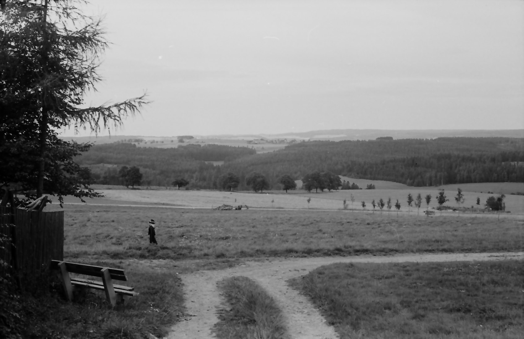 Aussichtsbank an einer Zaunecke, im Hintergrund die Bäume am Weg zur Haarmühle, rechts die Huhle, das Haus Am Spitzenteich 3b gab es noch nicht