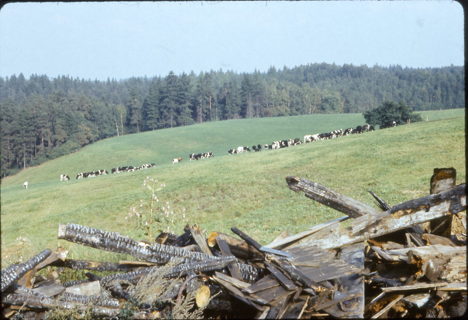 Blick von der Huhle über verkohlte Balken zu einer Kuhherde vor Wellers Hopfen