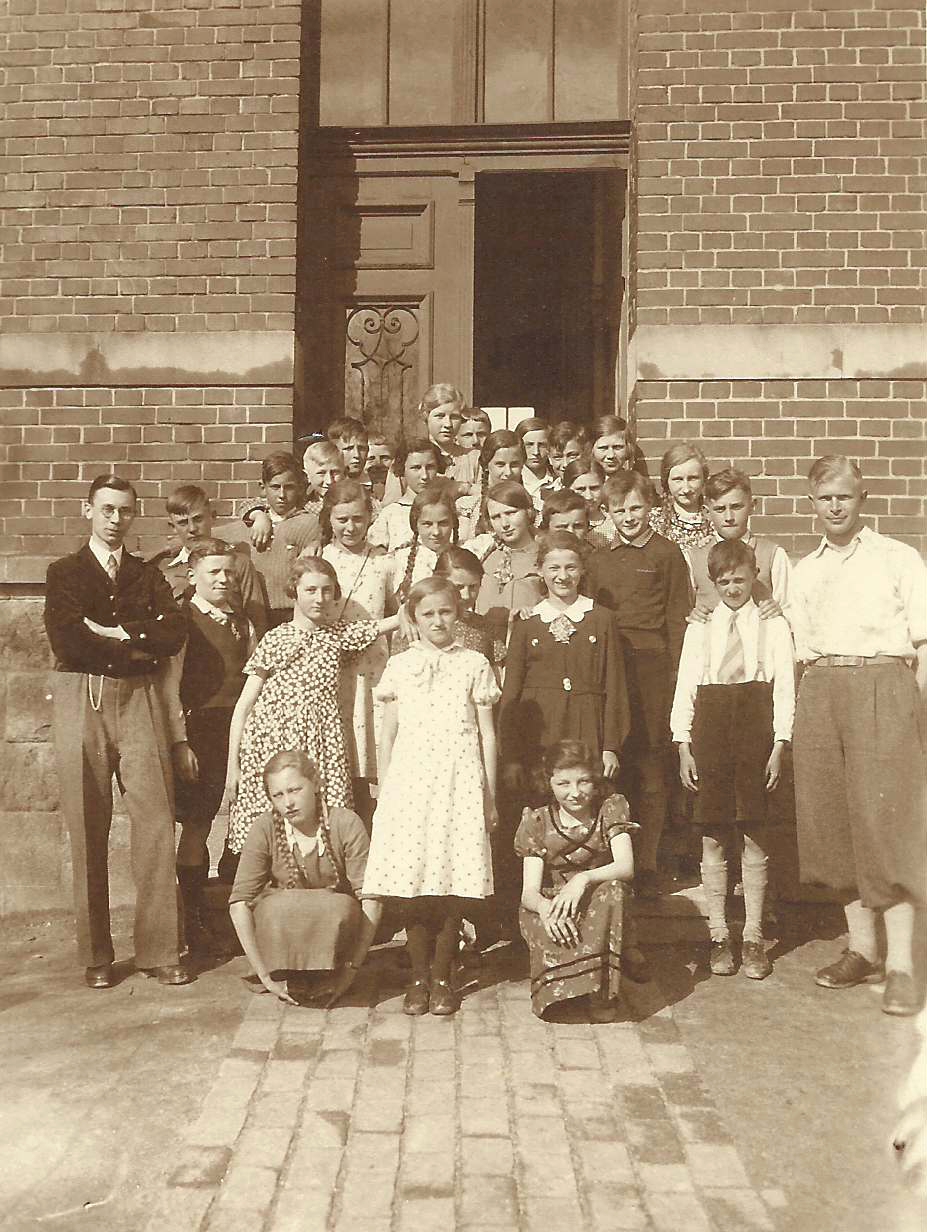 Eine Gruppe größerer Schüler und zwei Lehrer (links Herr Petzold) haben sich für ein Gruppenfoto vor der Schultüre aufgestellt.