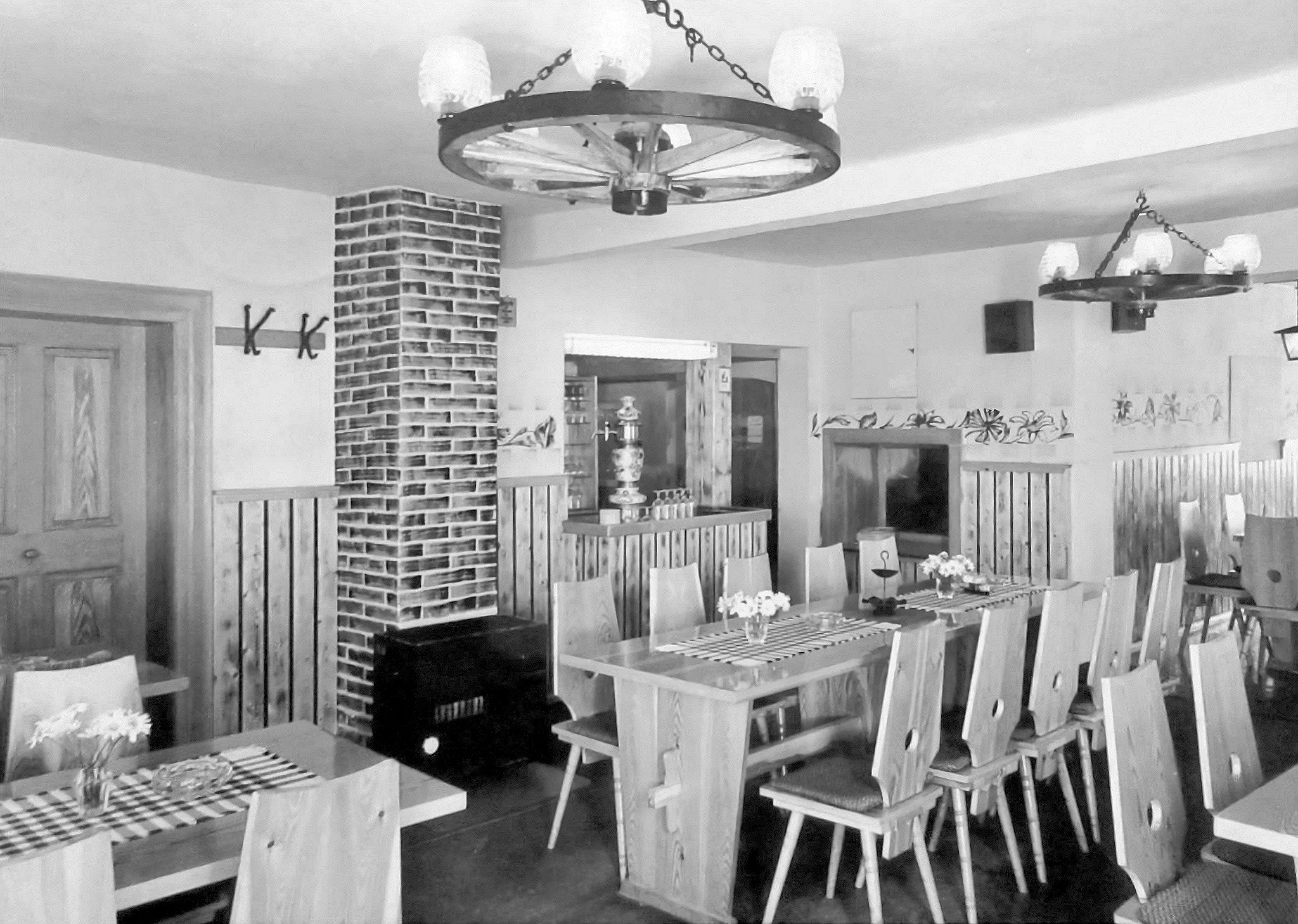 Die mit Holzmöbeln eingerichtete Gastststube. im HIntergrund der Dauerbrandofen und der alte Zapfhahn (früher DöllingsGasthof)