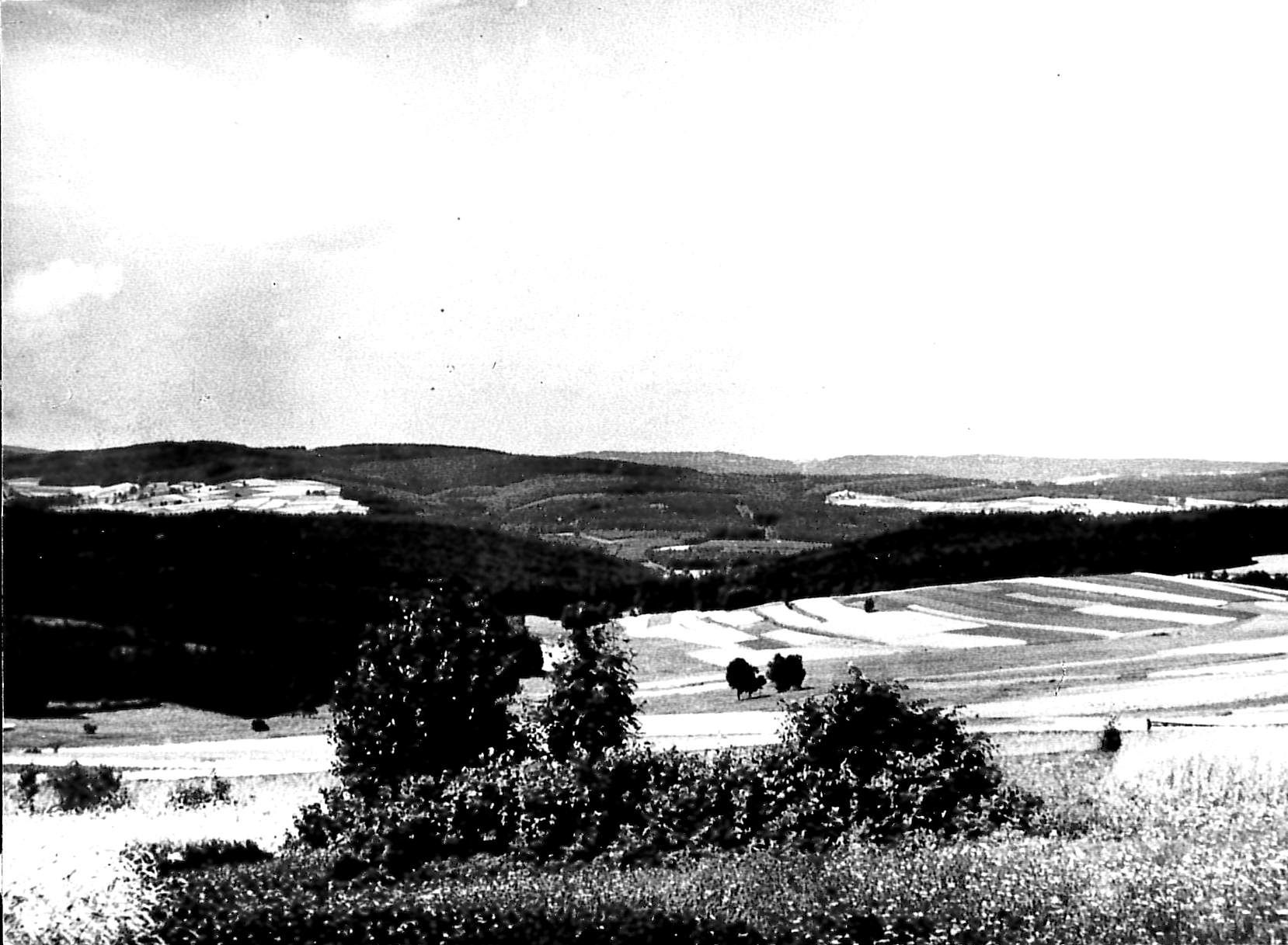 Blick in Richtung Taiga auf die noch in kleine Felder aufgeteilte Fläche, im Vordergrund Brombeersträucher