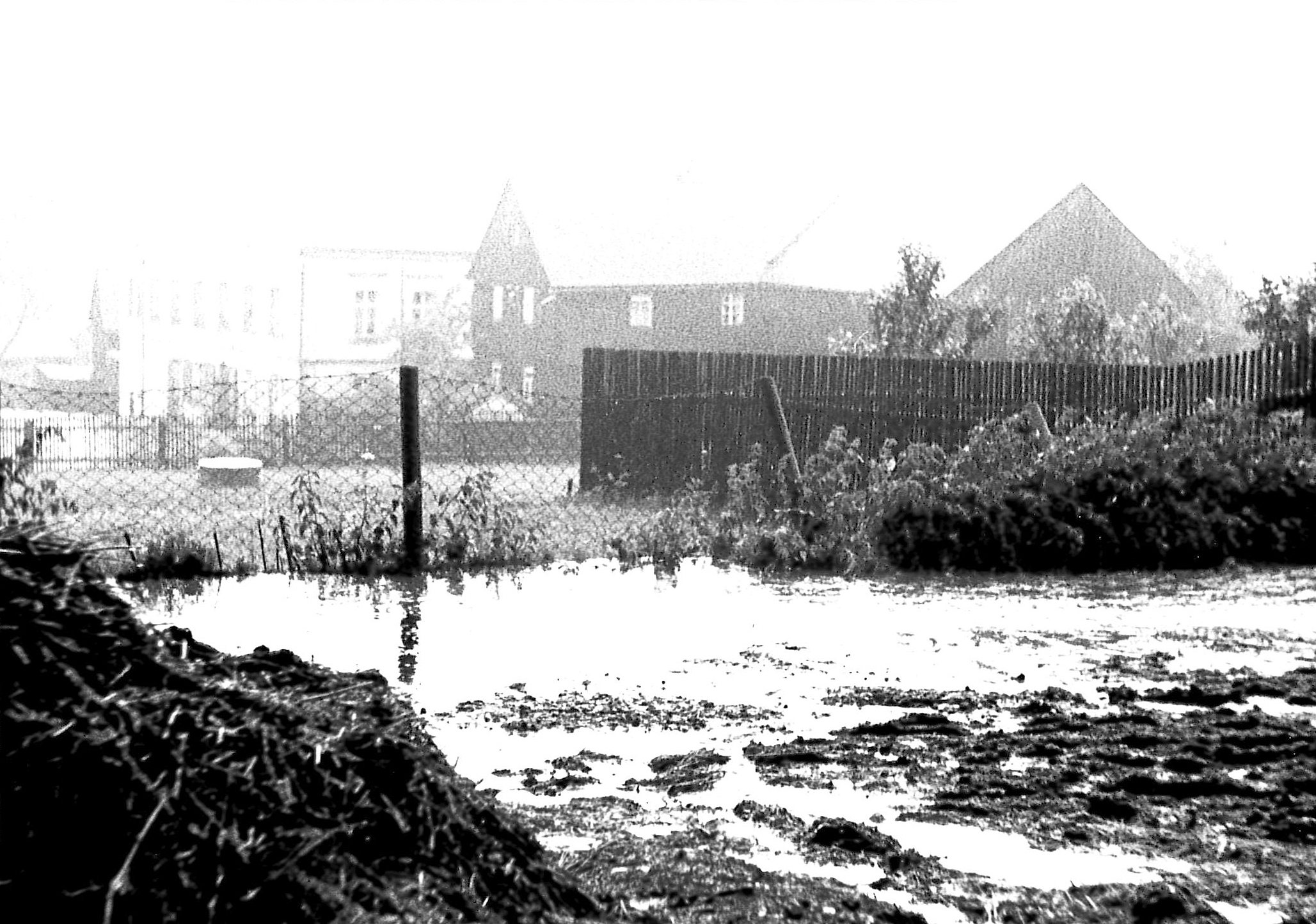 Der bis zum Rand gefüllte Schulteich. Im Hintergrund das tiefer liegende Spitzenhaus.