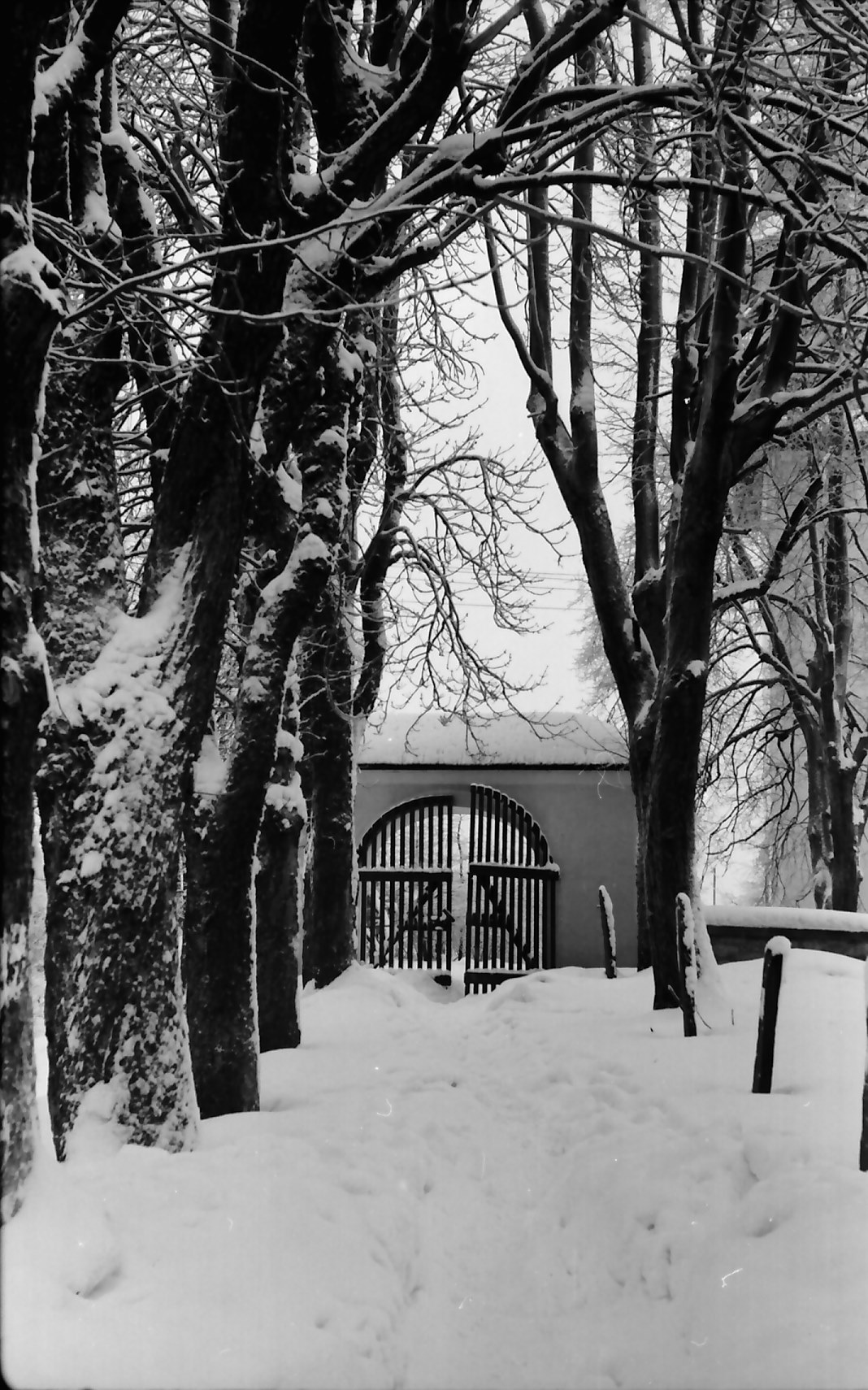 Der tief verschneite, mit alten Kastanien gesäumte Aufgang zum Tor zum Kirchgelände.