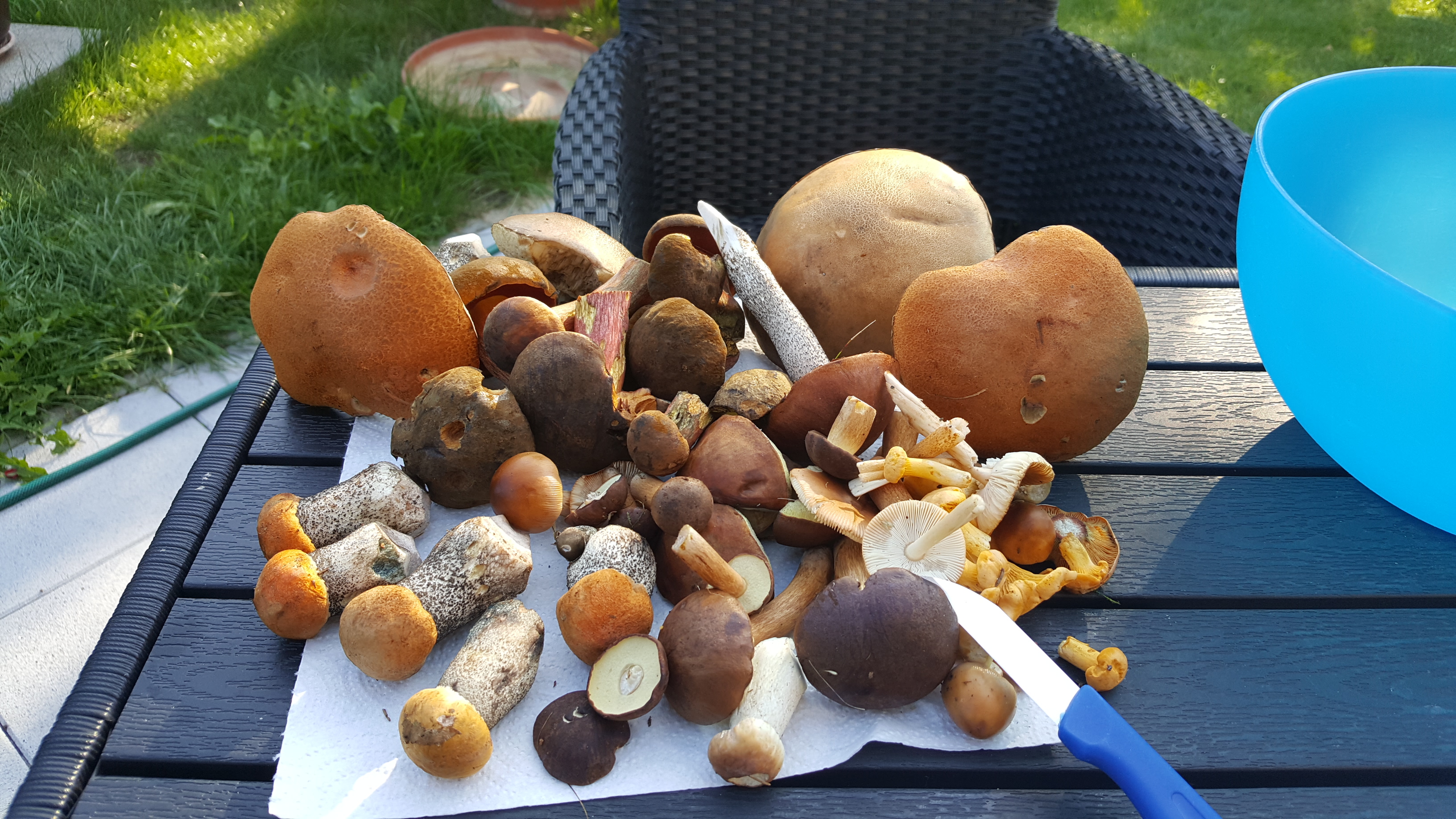 Zu sehen sind geputzte Pilze auf einem Gartentisch: Vile (auch große) Rotkappen, Birkenpilze, Hexenröhrlinge (auch Schusterpilze genannt), Maronen, Steinpilze, Pfifferlinge, Scheidenstreiflinge und ganz rechts ein Reizger.