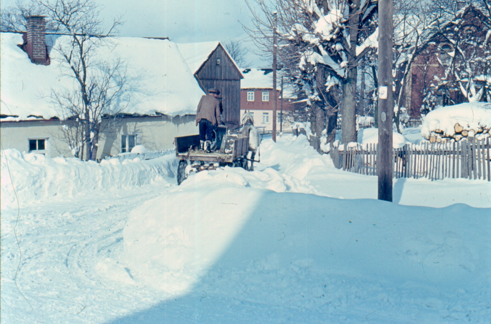 Ein Pferdewagen mit einem einzelnen Schimmel fährt auf dem Wernitzgrüner Weg am ehemaligen Armenhäuschen vorbei. An den Wegesrändern hoch aufgetürmte Schneewälle, alle Häuser sind schneebedeckt.