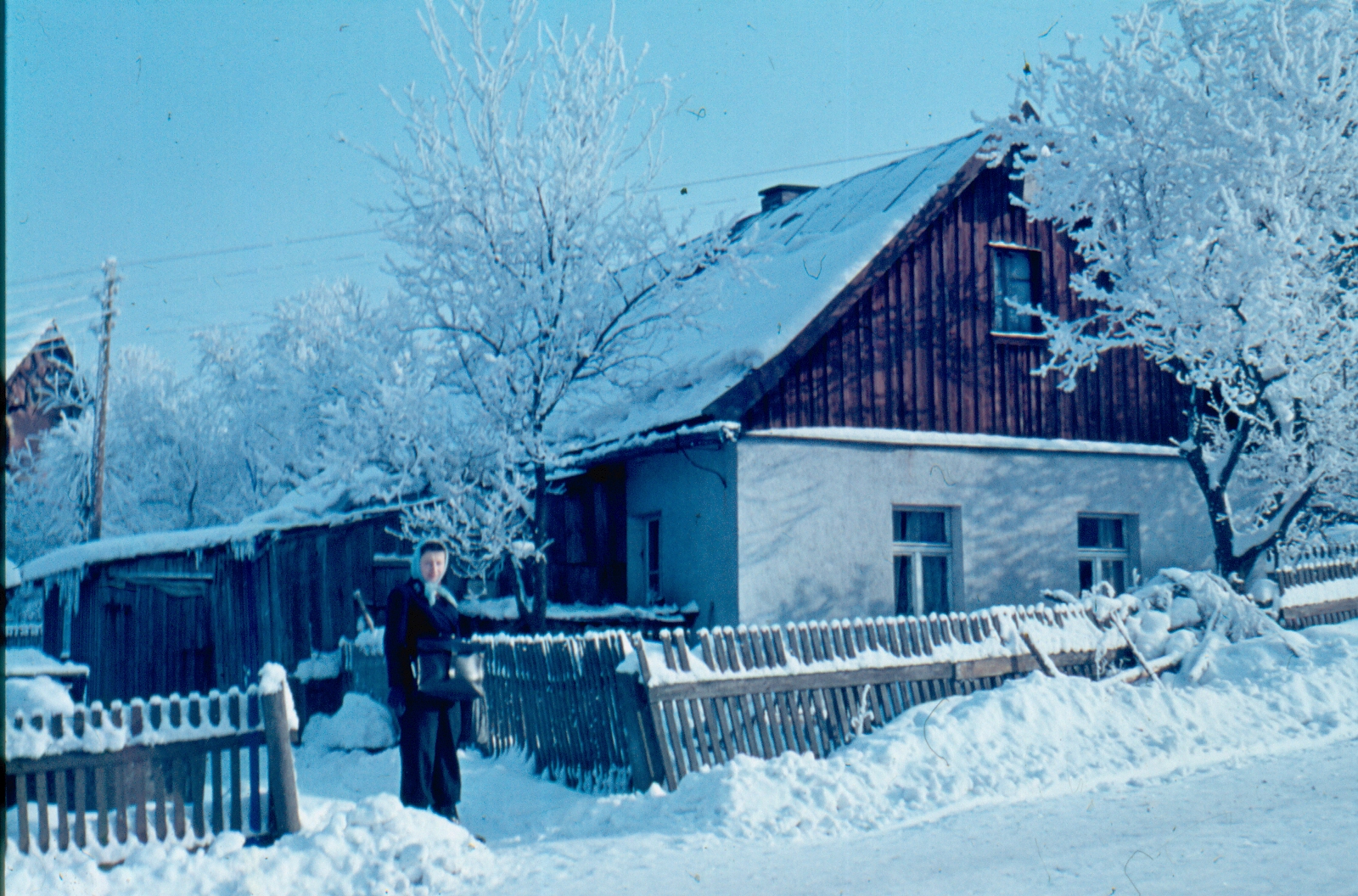 Briefträgerin mit Posttasche vor dem ehemaligen Armenhäuschen