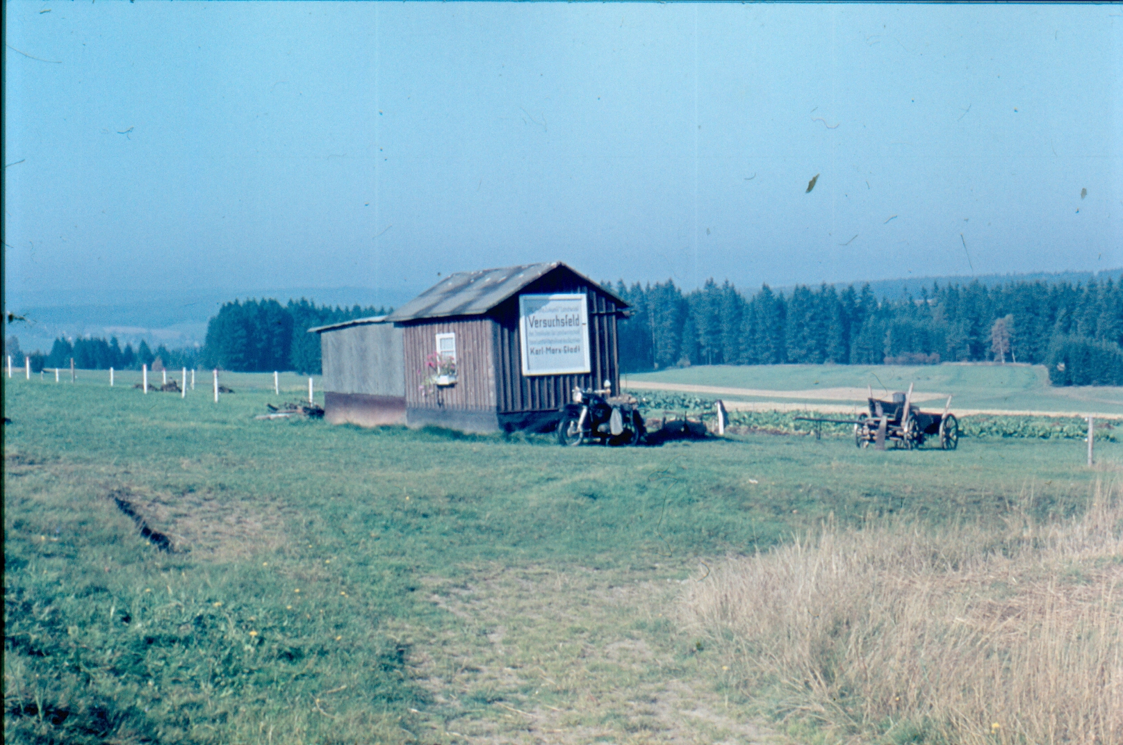 Ein Schuppen mit einem Schild, welches auf ein dahinter liegendes und mit weißen Pfählen markiertes Versuchsfeld hinweist.davor ein Motorrad und ein abgestellter Pferdewagen. Die Szene ist von WIesen und einem Rübenfeld umgeben.