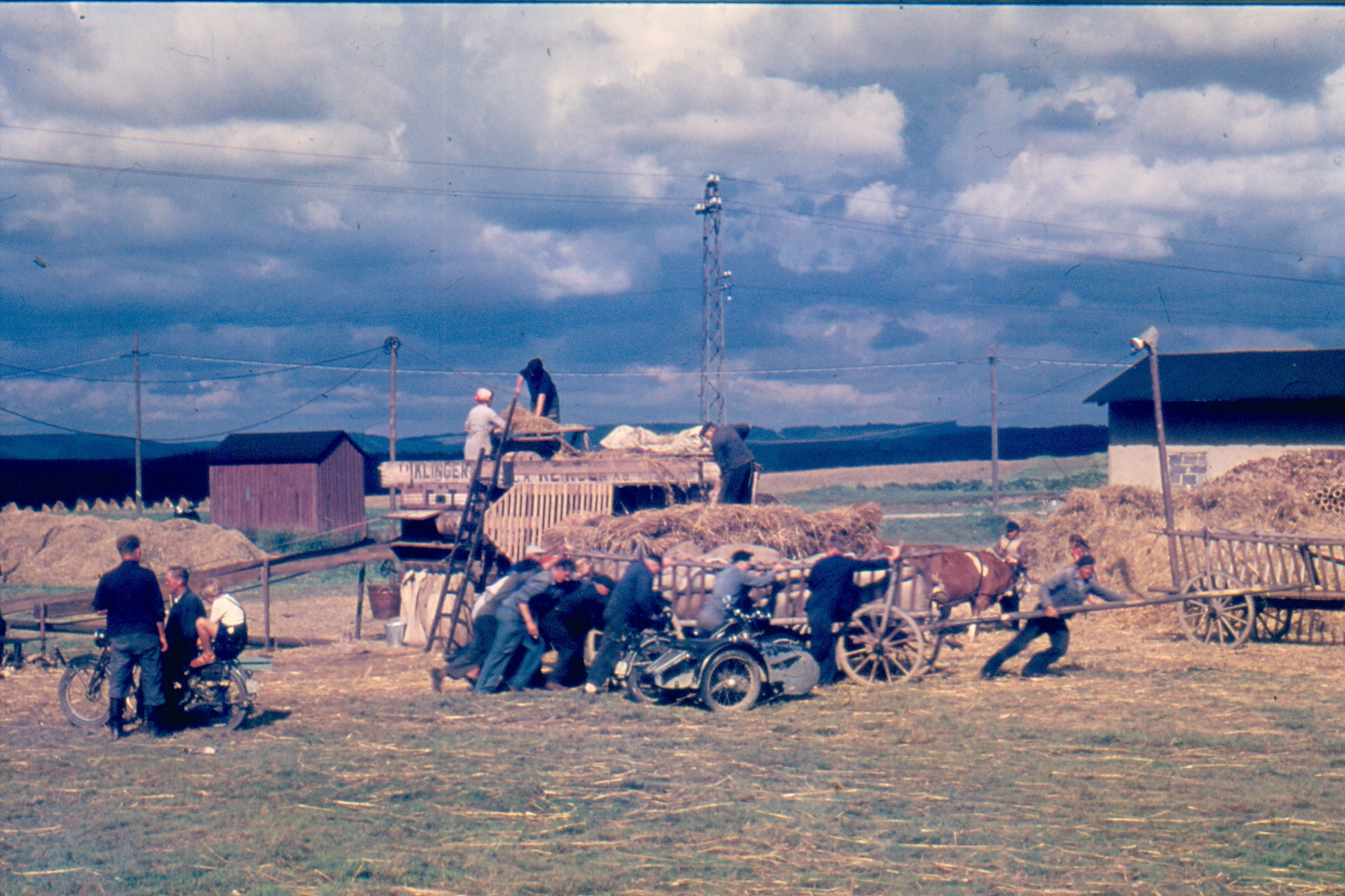 Bauern schieben einen Leiterwagen auf dem ehemaligen Anger mit gefüllten Säcken, im Hintergrund läuft die Dreschmaschine, ein Ochsengespann steht bereit. Links Personen im Gespräch an und auf einem Motorrad.