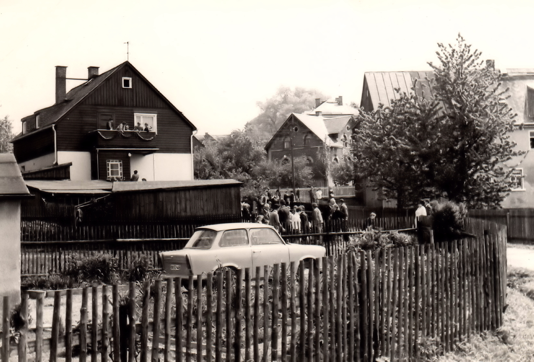 Auf den Umzug zur 650-Jahr-Feier wartende, festlich gekleidete Personen am Rande des Wernitzgrüner Weges, mit Girlanden geschmückte Häuser. Im Vordergrund in einem Garten ein TRabbi.
