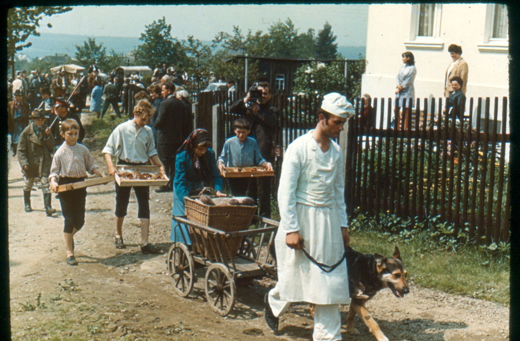 Während des Umzuges, ein Bäcker mit Waren und Gesellen, der Handwagen wird von einem Hund gezogen, im Hintergrund der Kameramann des Fernsehens.