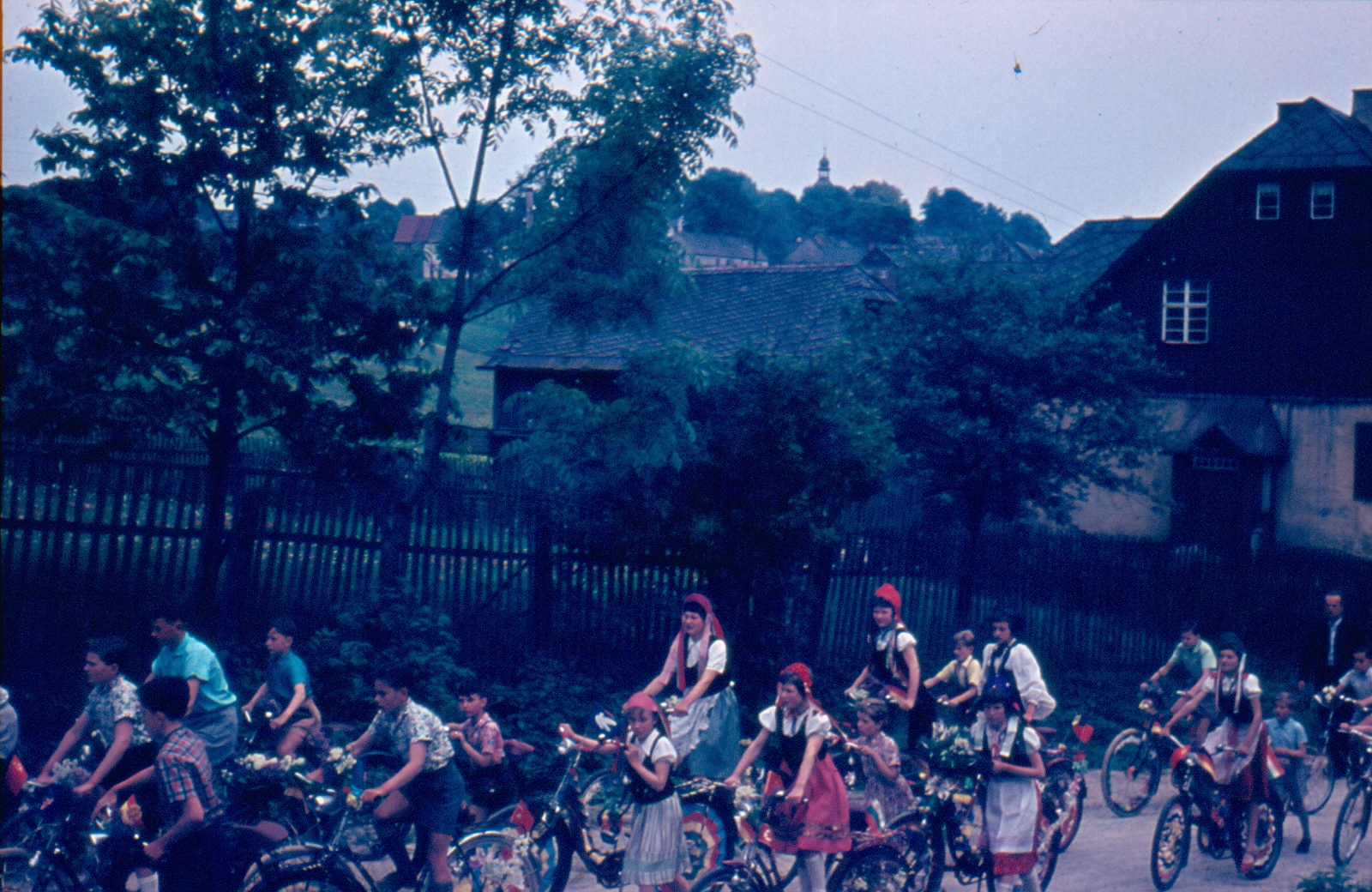 Umzug größerer Kinder mit Fahrrädern zum Kinderfest 1964