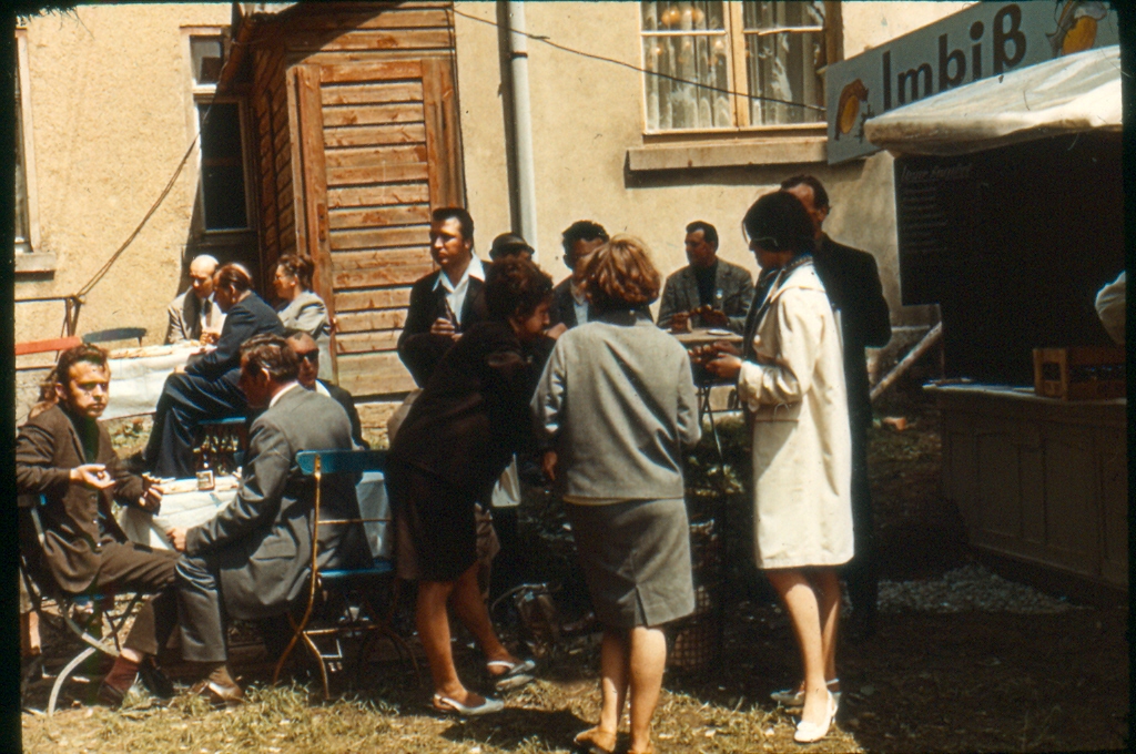 Herren und Damen verschiedenen Alters sitzen an Tischen und stehen vor einem Imbissstand direkt vor dem Goldenen Stern