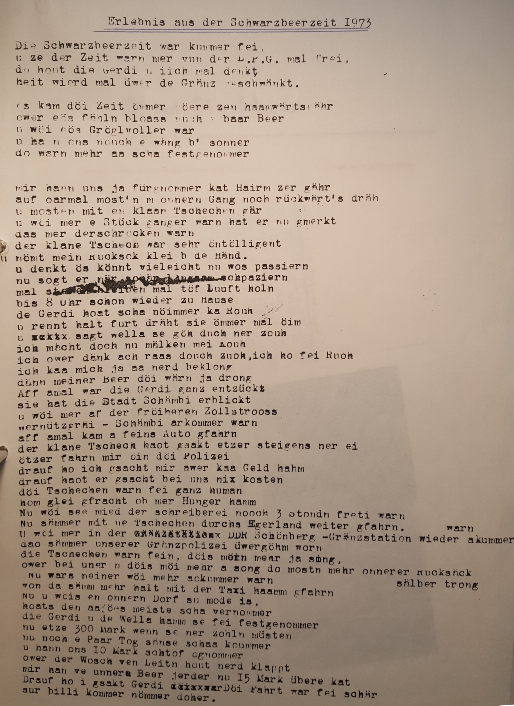 In Mundart gereimte Geschichte von Wella Wunderlich und Gerti Weller, wie sie beim Schwarzbeersuchen von tschechischen Grenzern wegen illegalem Grenzübertritt verhaftet wurden, zum Teil schwierig zu lesen.