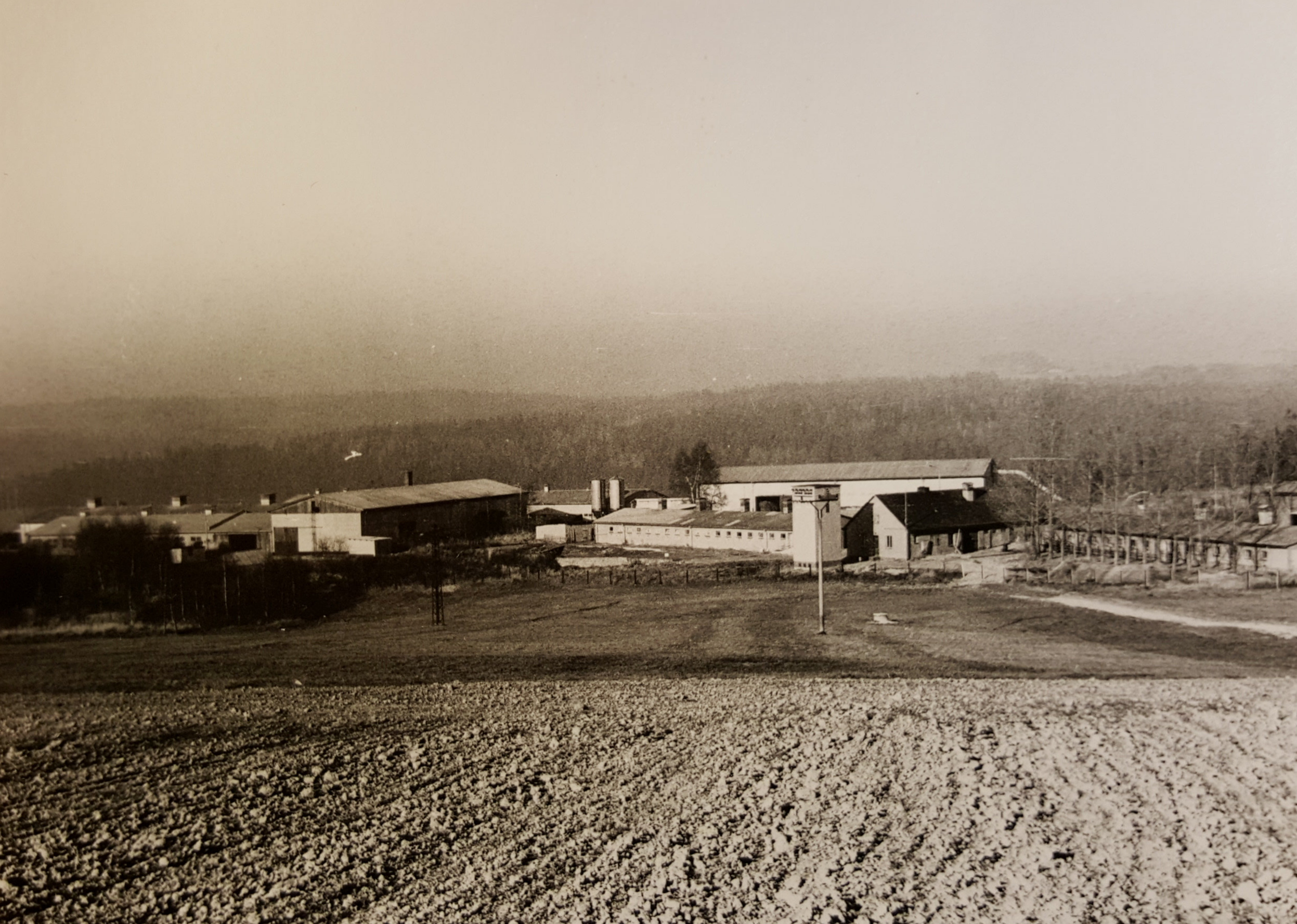 Von einem oberhalb gelegenen Feld aus sind die Stallgebäude der LPG zu sehen, in der Mitte halb rechts der Stromverteilerturm.
