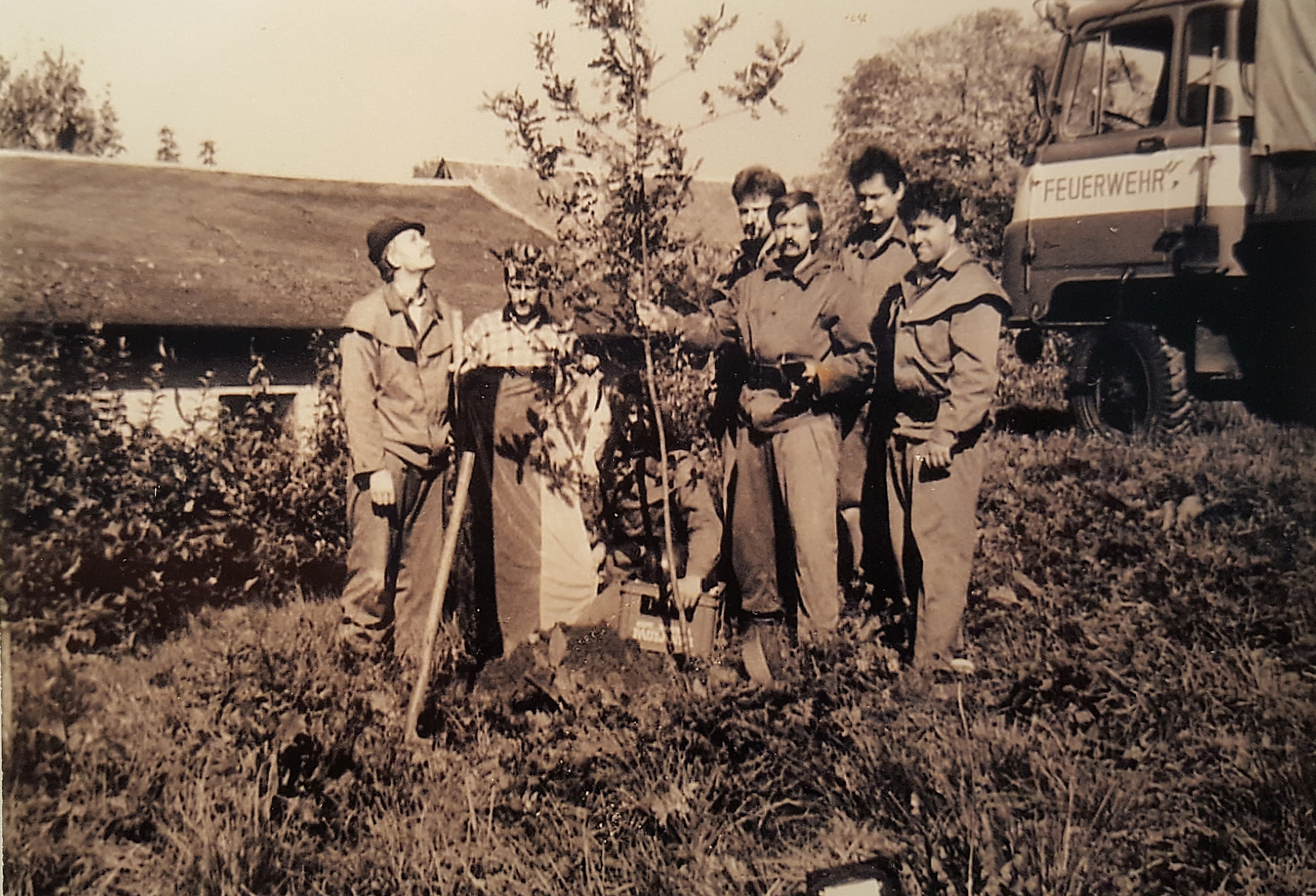 Kameraden der Freiwilligen Feuerwehr von Landwüst nach dem Pflanzen eines Baumes am Damm des Schulteiches