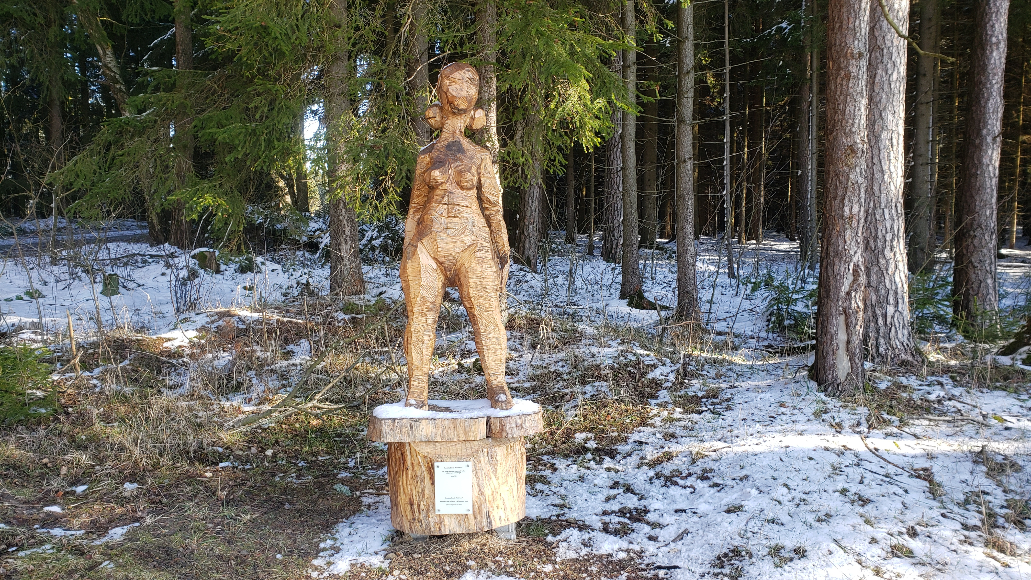 Am neu eingerichteten und von Skulpturen gesäumten Besinnungsweg von Erlbach über Luby (Schönbach) bis nach Landwüst steht am Streitweg die Skulptur „Kleine Frau“ von Franziska Scholz: Gott sah an alles, was er gemacht hatte, und siehe, es war sehr gut. (1. Mose 1,31a). Die Holzskulptur steht auf einem Sockel mit Schild mit den genannten Informationen. Im Hintergrund der Wald mit Schneeresten, links der Streitweg in Richtung Wernitzgrün.