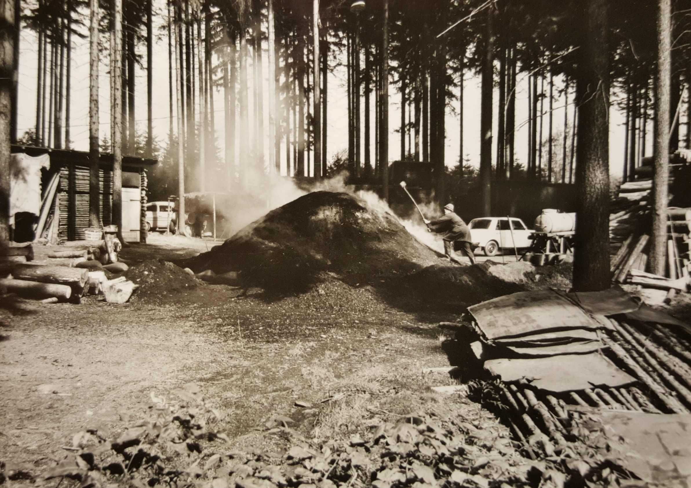Rauchender Meiler im Hochwald, Köhler bei der Arbeit, im Hintergrund Wasserbehälter, Wartburg, Hütte, der Meiler wurde 1970 durch Eberhard Puggel in Betrieb genommen.